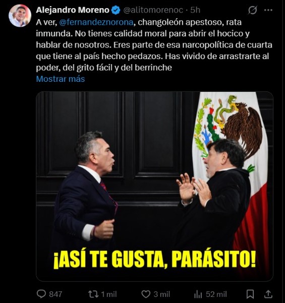Algo que distinguió este enfrentamiento de otros previos fue el uso de herramientas digitales. Alejandro Moreno acompañó su publicación con una imagen generada con Inteligencia Artificial (IA) que lo muestra a él gritándole de frente a un Noroña visiblemente asustado, con la leyenda: “Así te gusta, parásito”.