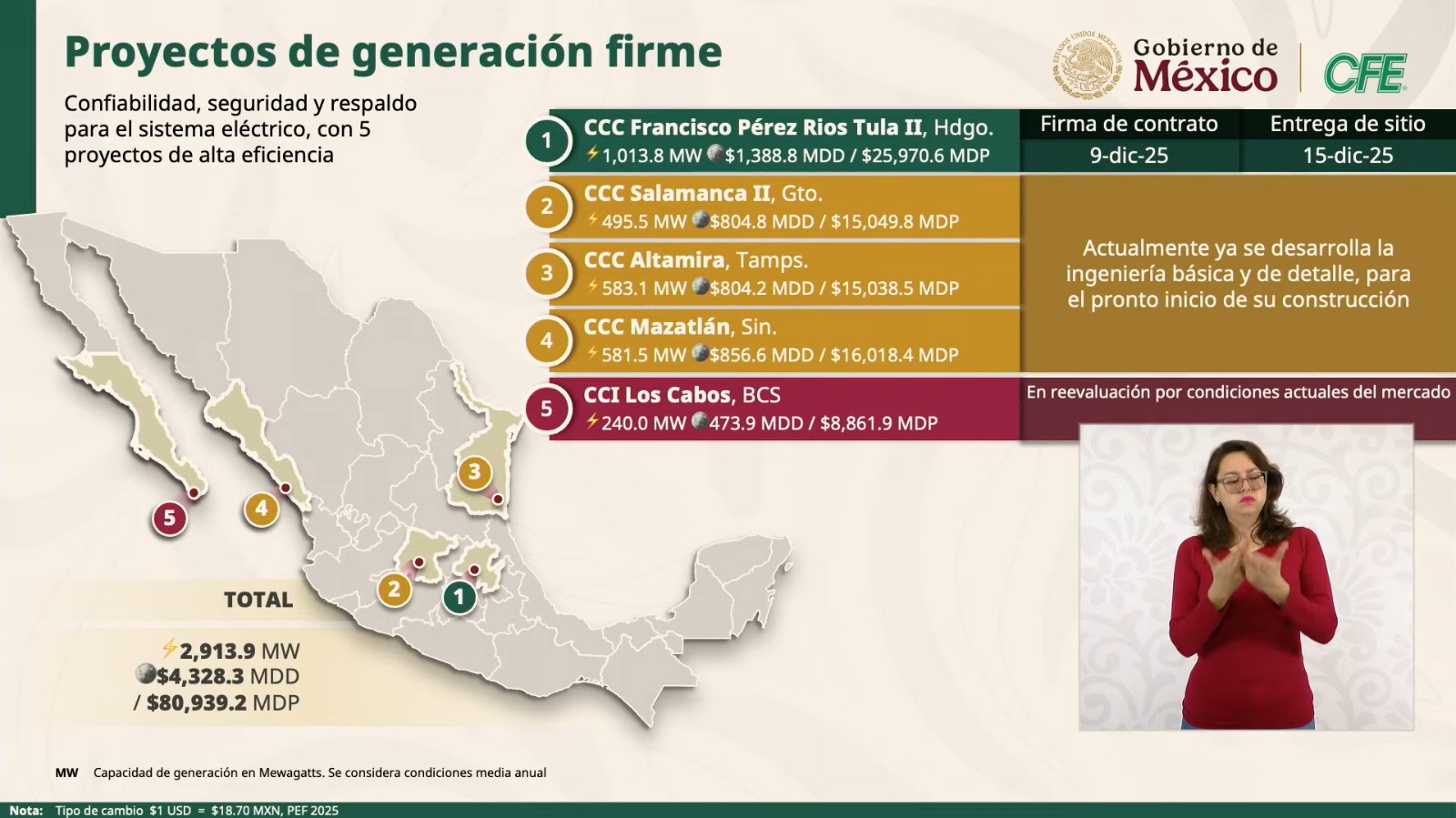 La titular de la CFE detalló que se contemplan cinco proyectos de generación que permitirán adicionar cerca de tres mil megawatts de capacidad instalada, con una inversión estimada de 4 mil 328 millones de dólares. Señaló que estas centrales aportarán un respaldo relevante al sistema eléctrico nacional debido a su ubicación estratégica en distintas regiones del país.