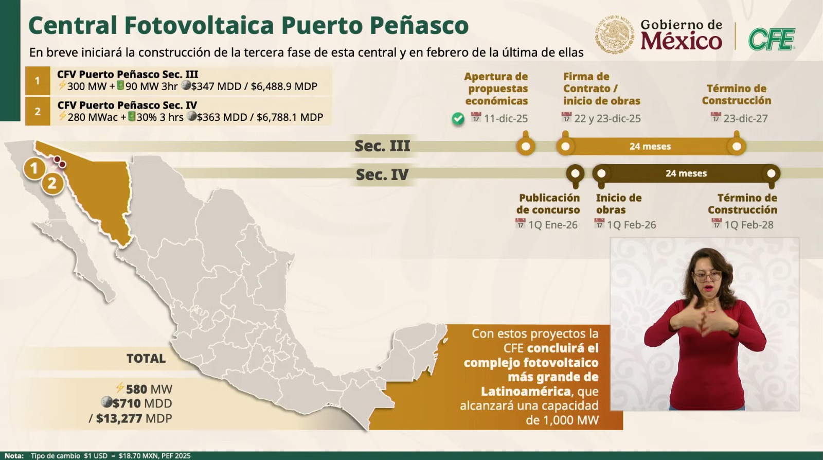 Asimismo, destacó los avances de la central fotovoltaica de Puerto Peñasco, en Sonora, cuya fase tres iniciará construcción la próxima semana, además de nuevos proyectos solares orientados a incrementar la entrega de energías limpias. En materia de transmisión, subrayó que los proyectos están enfocados en reforzar la red existente para acompañar el crecimiento de la demanda eléctrica.