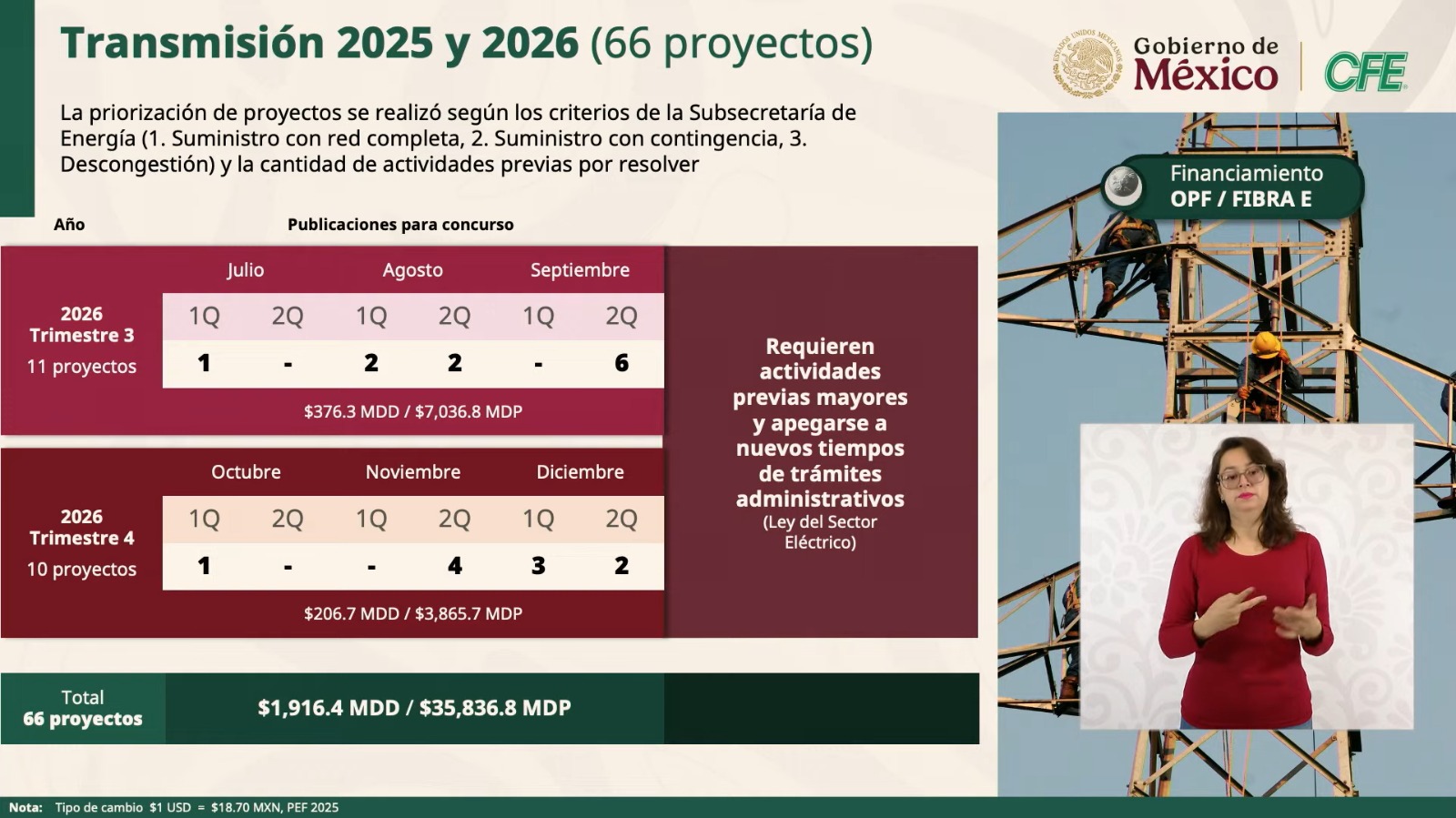 Calleja indicó que se ejecutarán 66 proyectos de transmisión en lo que resta de 2025 y durante 2026, mientras que para el próximo año se han considerado 44 proyectos en su totalidad. En ese sentido, llamó a la industria mexicana a sumarse a estas iniciativas, con el objetivo de incrementar el contenido nacional, bajo reglas claras y dentro del marco legal.