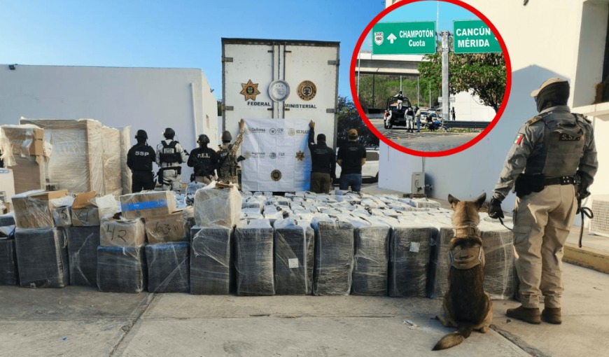 En Campeche, al revisar un vehículo que viajaba de Guadalajara a Cancún, elementos federales y estatales detuvieron a dos personas y confiscaron 39 kilos de metanfetamina, 1,575 kilos de marihuana, 1.4 kilos de una sustancia sólida y granulada, así como vapeadores. El valor estimado de la droga asciende a 15.6 millones de pesos.