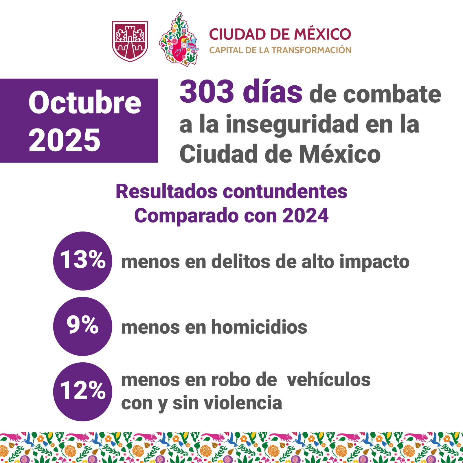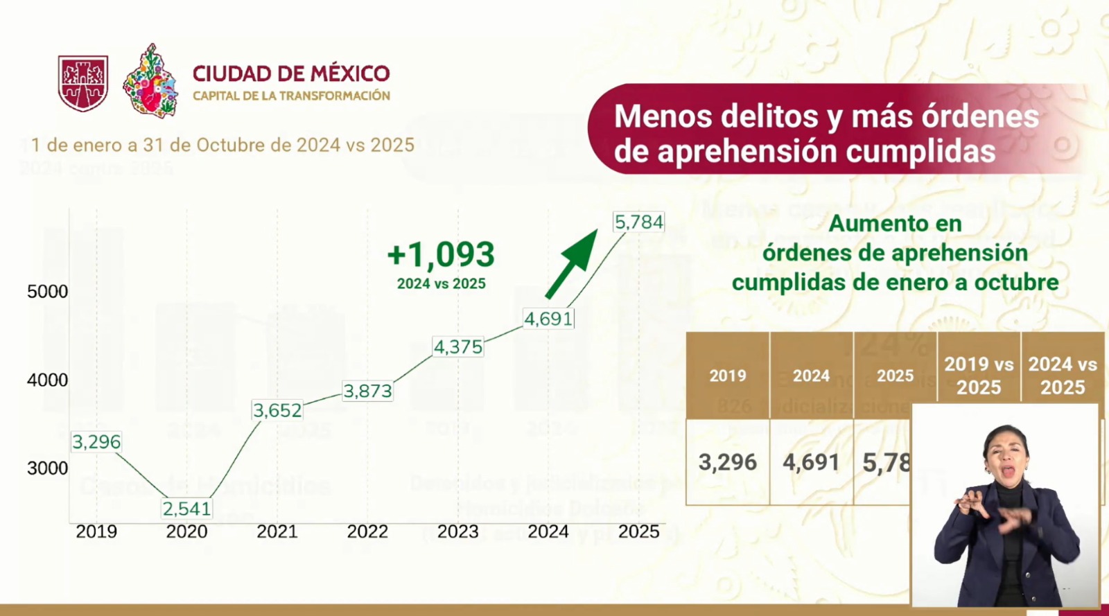 La jefa de Gobierno presentó un informe de seguridad en la CDMX, donde destacó que las acciones de su administración han permitido disminuir 13% los delitos de alto impacto respecto a 2024 y 58% en comparación con 2019