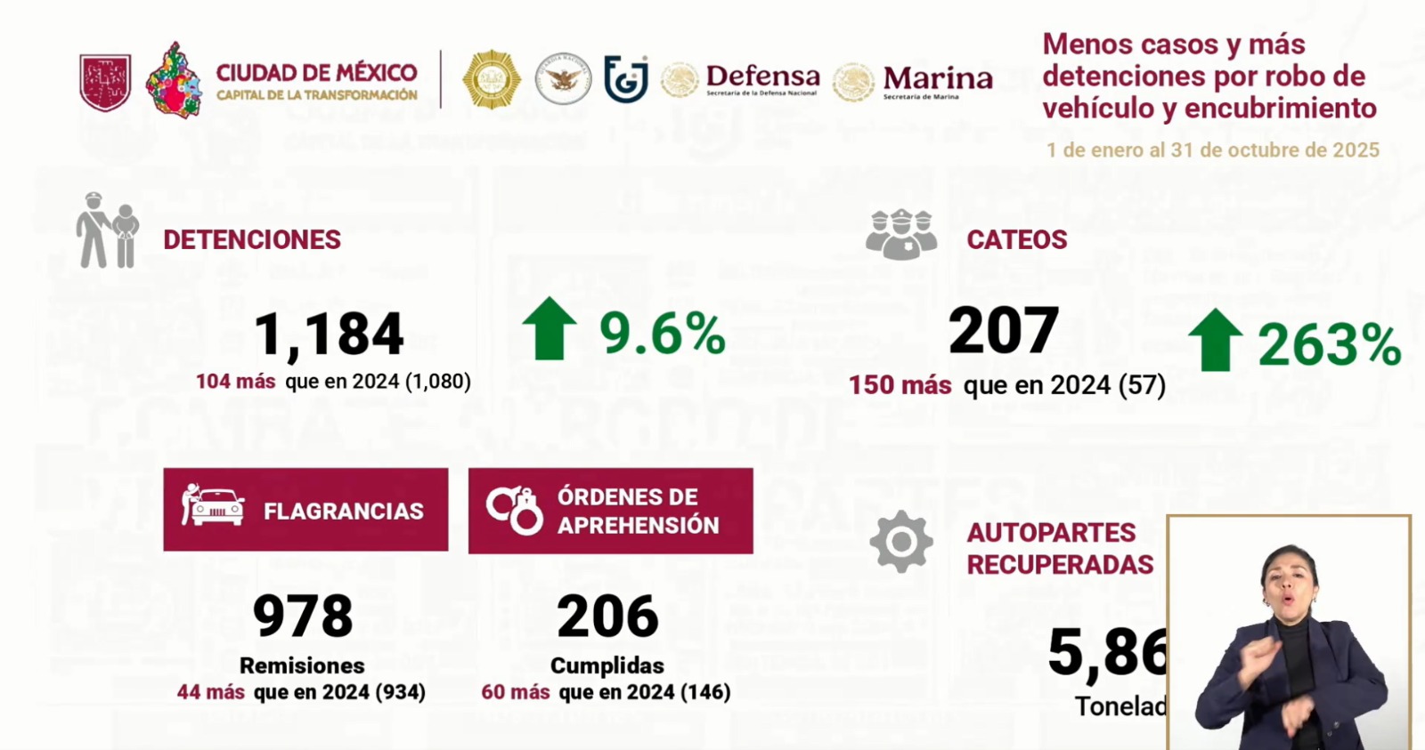 Respecto a los feminicidios, la jefa de Gobierno destacó que este delito tuvo una disminución del 32.2% en comparación con 2024, mientras que las detenciones y judicializaciones aumentaron 23.2%. De los 40 feminicidios registrados en el año, el 92% cuenta con detenido o con orden de aprehensión. Subrayó que su administración mantiene una política de “cero impunidad” ante cualquier forma de violencia contra las mujeres.