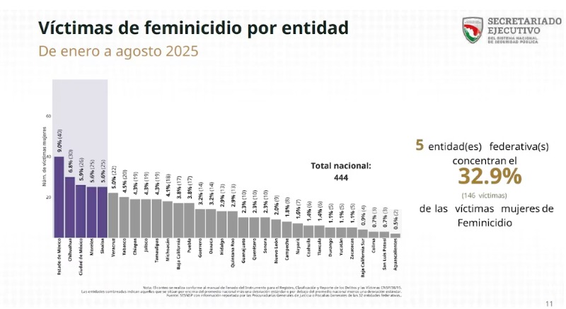 El informe del SESNSP detalló que el Estado de México encabeza las cifras con 40 feminicidios, seguido por la Ciudad de México con 26, Morelos con 25 y Puebla con 17. Tres de estas entidades se encuentran entre las cinco con mayor número de víctimas en el país.