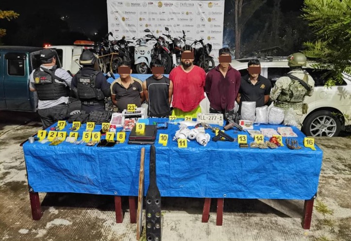 En Mártires de Tacubaya, Oaxaca, fuerzas federales y estatales detuvieron a cinco personas y aseguraron tres armas largas, dos cortas, cinco cargadores, 416 cartuchos, diversas dosis de droga, una motocicleta y un vehículo.