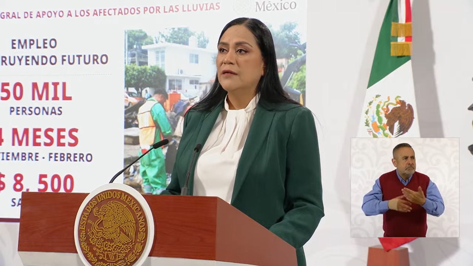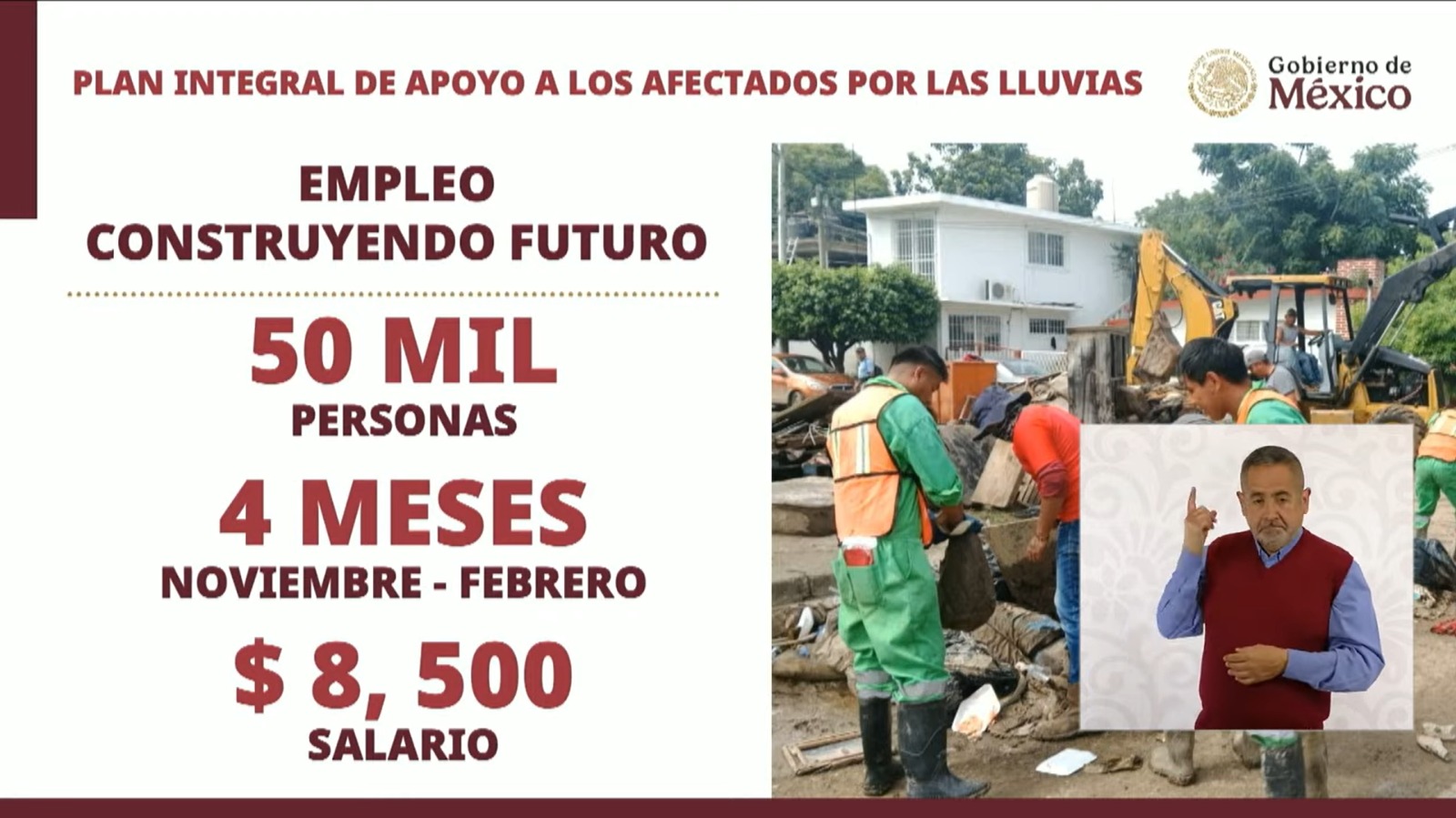 El Gobierno de México pondrá en marcha el programa “Empleo Construyendo el Futuro”, mediante el cual se contratará a 50 mil personas para trabajar durante cuatro meses en tareas de reconstrucción de caminos y recuperación comunitaria en las zonas afectadas por las lluvias. Cada participante recibirá un salario mensual de 8 mil 500 pesos, informó la titular de la Secretaría de Bienestar, Ariadna Montiel Reyes.