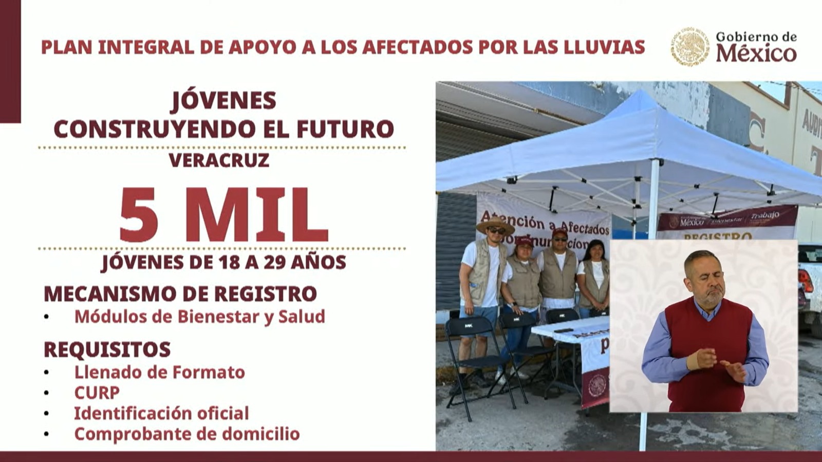 De manera adicional, se reforzará el programa Jóvenes Construyendo el Futuro, particularmente en el estado de Veracruz, donde 5 mil jóvenes se integrarán a brigadas de limpieza en los municipios de Poza Rica y Álamo. Para ello, se instalaron 24 módulos de registro en Poza Rica y 14 en Álamo, donde ya se lleva a cabo el proceso de inscripción.