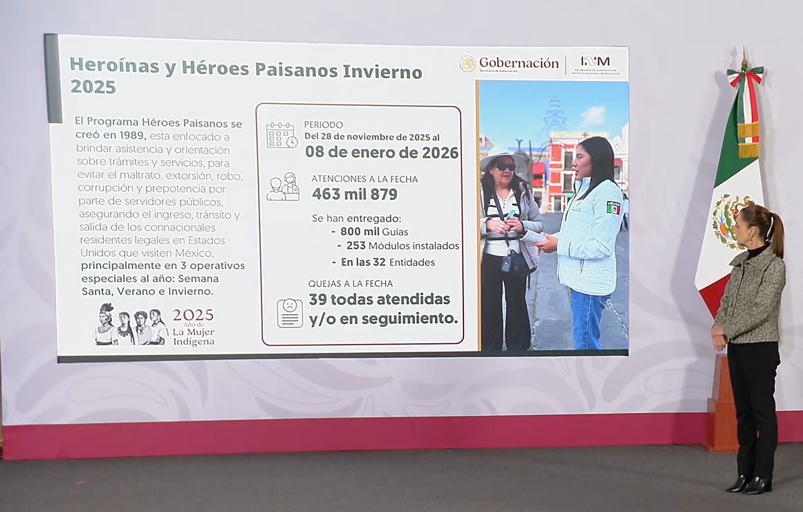 Sergio Salomón Céspedes Peregrina, comisionado del Instituto Nacional de Migración (INM), informó que el Programa heroínas y héroes. Paisanos 2025 ha registrado 463 mil 879 atenciones y quejas resueltas desde su arranque el 28 de noviembre, como parte del operativo vigente hasta el 8 de enero de 2026, enfocado en proteger la integridad y garantizar los derechos humanos de las y los connacionales que ingresan al país a través de 194 puntos de internación, de los cuales 56 se ubican en la frontera norte.