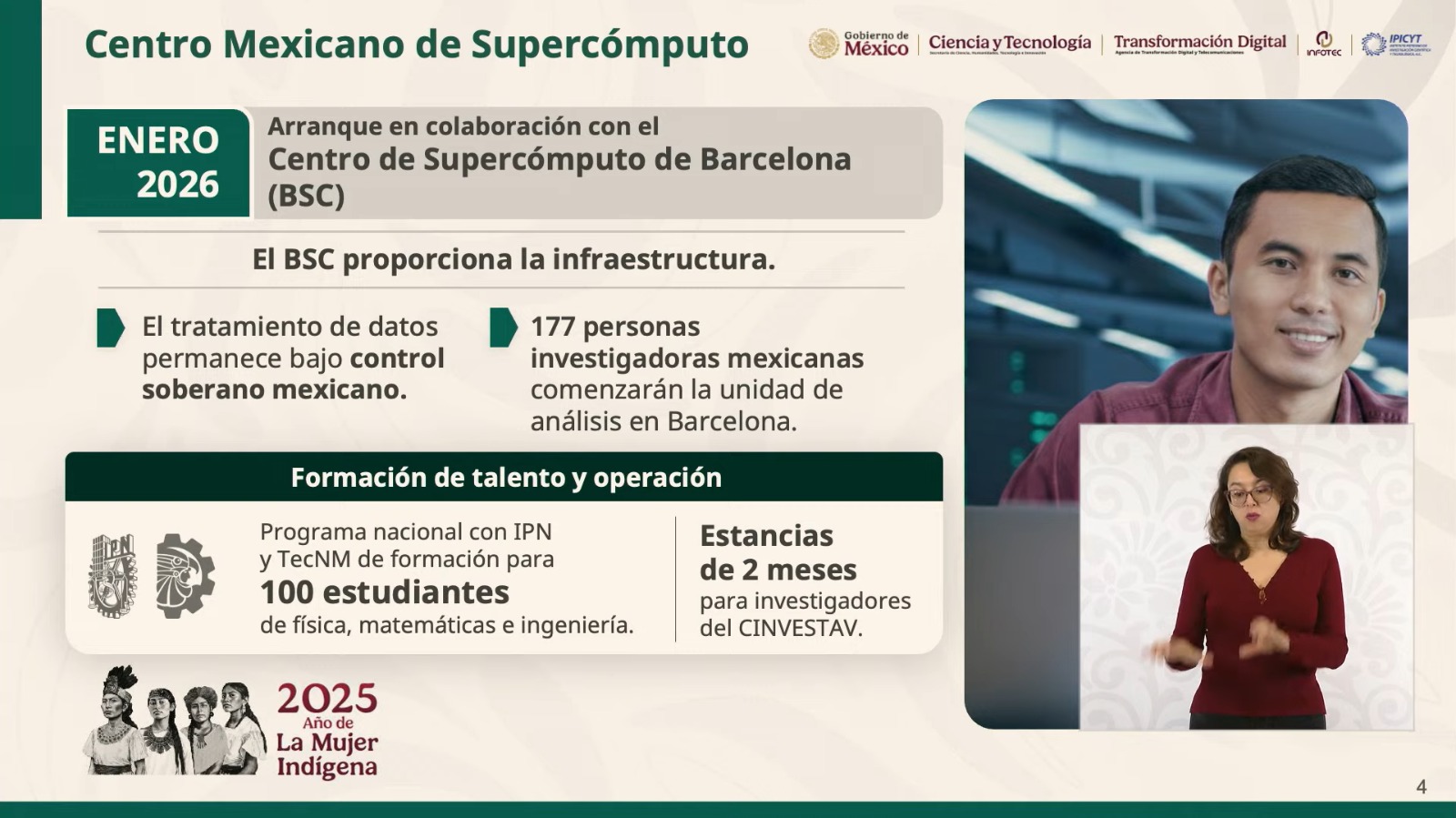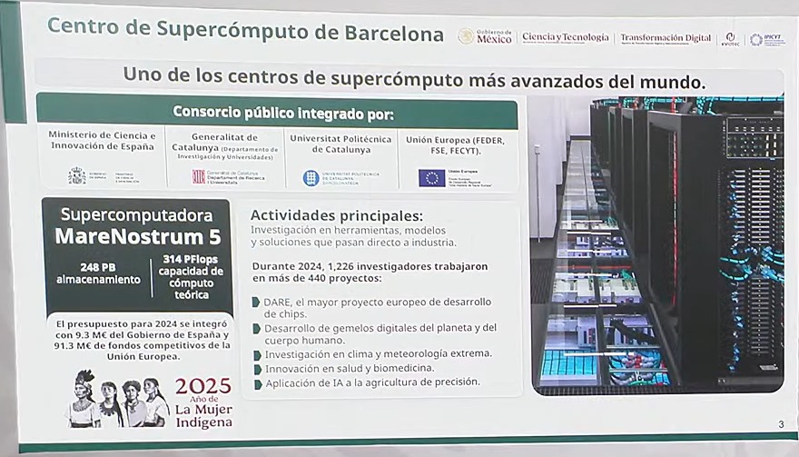 En el marco del Plan México, Pérez Hernández expuso que la supercomputadora mexicana será la más grande de la región y superará a la que actualmente opera en el sur del continente, administrada por una empresa privada. Recordó que Barcelona es reconocida como uno de los centros de supercómputo más importantes del mundo, con dos décadas de experiencia y equipos capaces de realizar hasta 314 billones de operaciones por segundo en su máximo teórico.