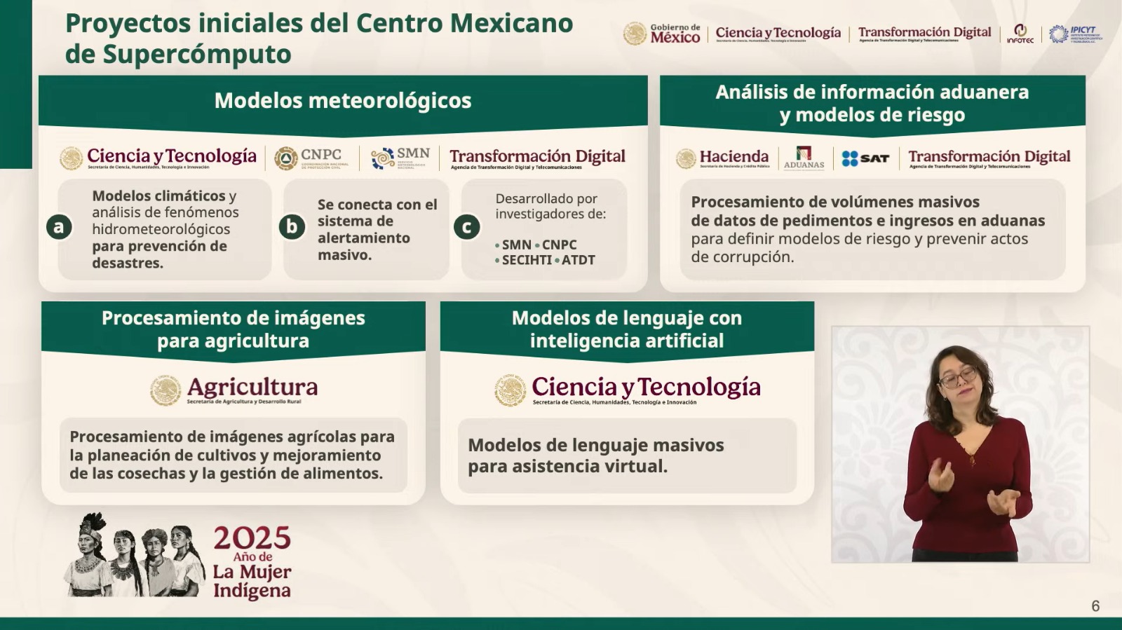 Durante la presentación del proyecto, la titular de la Secretaría de Ciencias, Humanidades, Tecnología e Innovación, Rosaura Ruiz Gutiérrez, destacó que este acuerdo se orienta a fortalecer la formación de recursos humanos, la transferencia tecnológica y la cooperación en áreas clave como salud, educación, desastres naturales y operación de sistemas de cómputo avanzado. Subrayó que, tras los episodios de lluvias extraordinarias registrados en cinco estados, mejorar la capacidad nacional de pronóstico climático se volvió una prioridad científica.