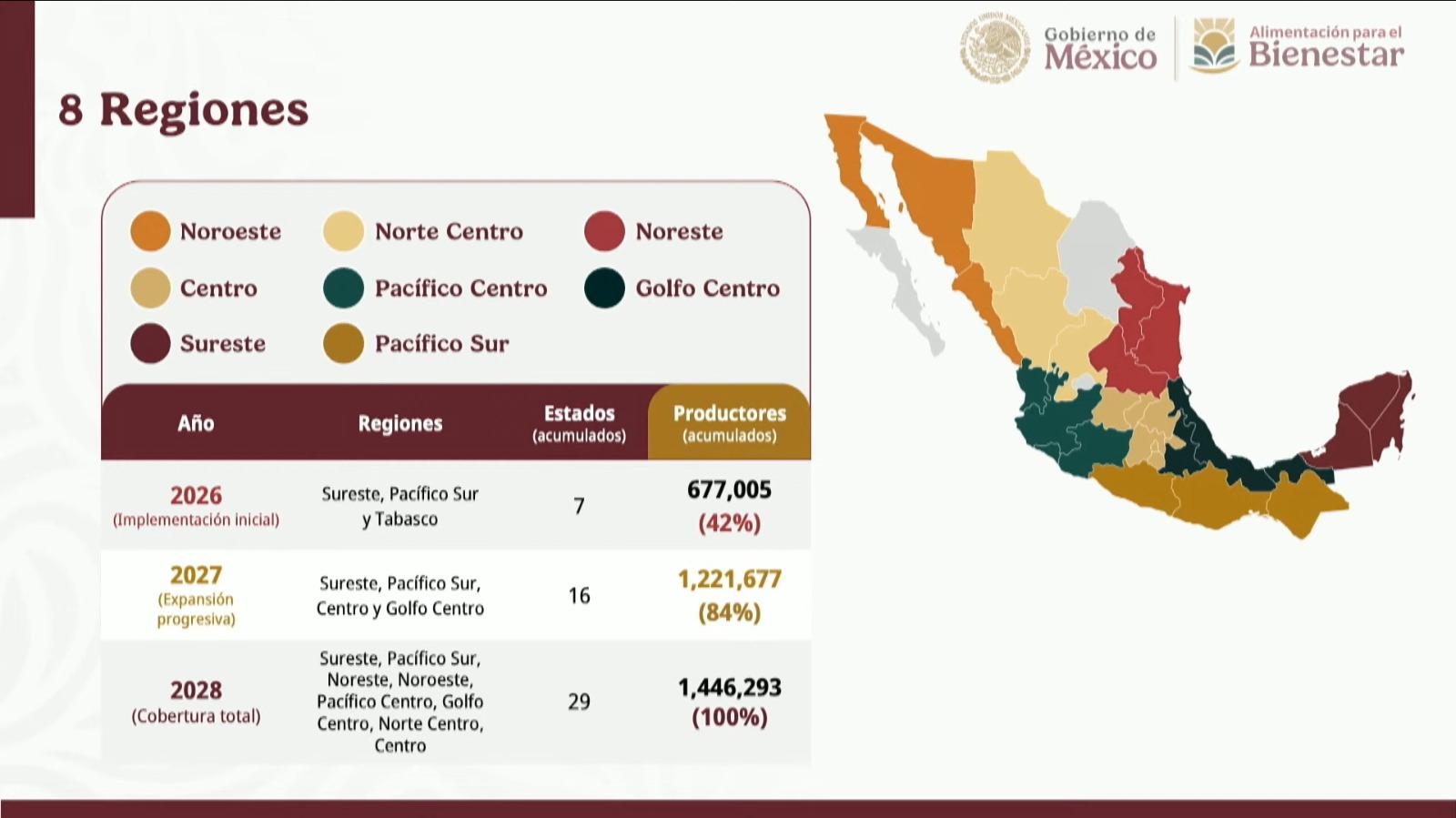 En su primera etapa, “El maíz es la raíz” atenderá a más de 677 mil productores en siete estados del sur y sureste: Oaxaca, Chiapas, Guerrero, Yucatán, Campeche, Quintana Roo y Tabasco, con presencia en 437 municipios y un incremento estimado del 20% en el rendimiento por hectárea.