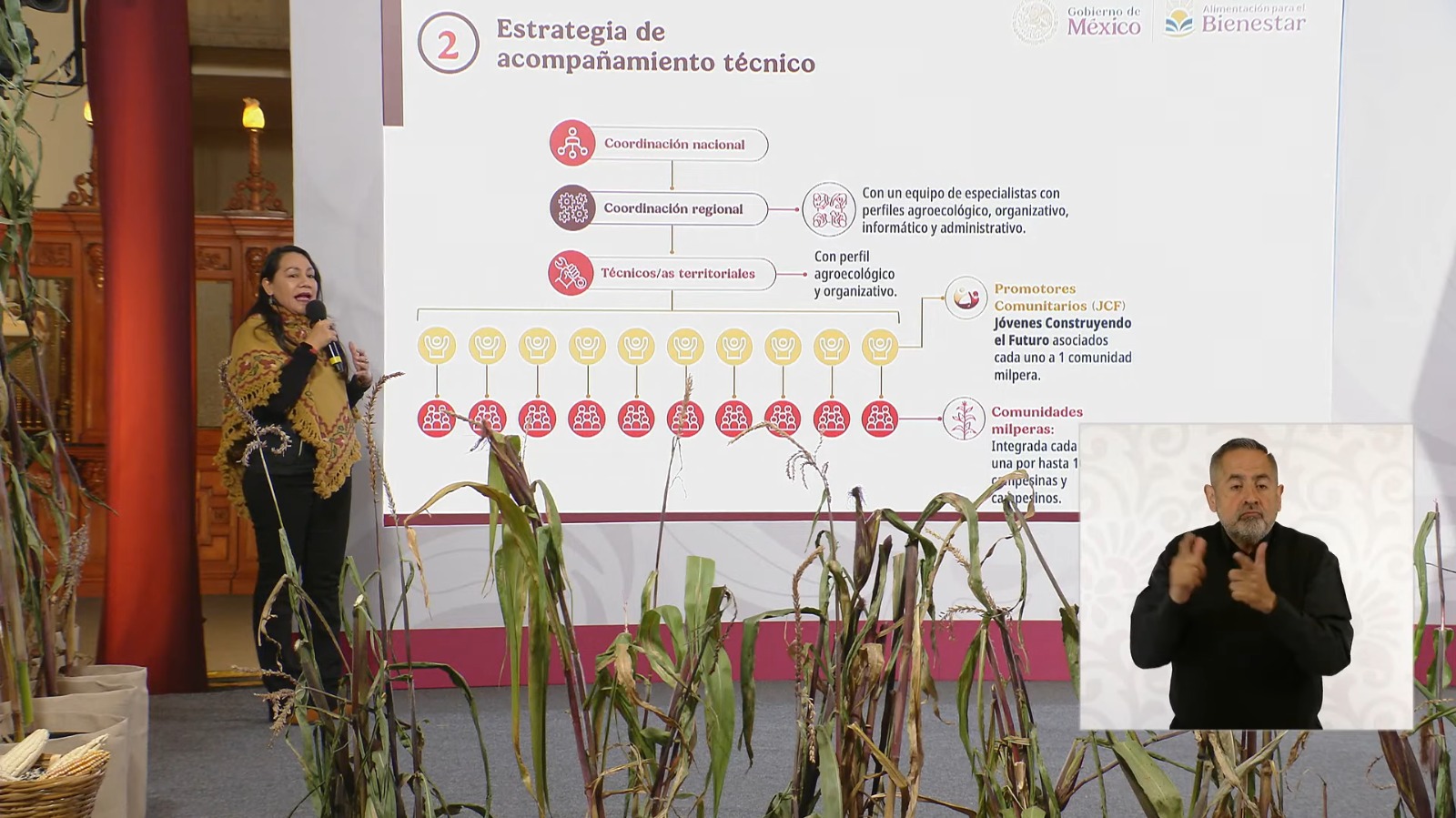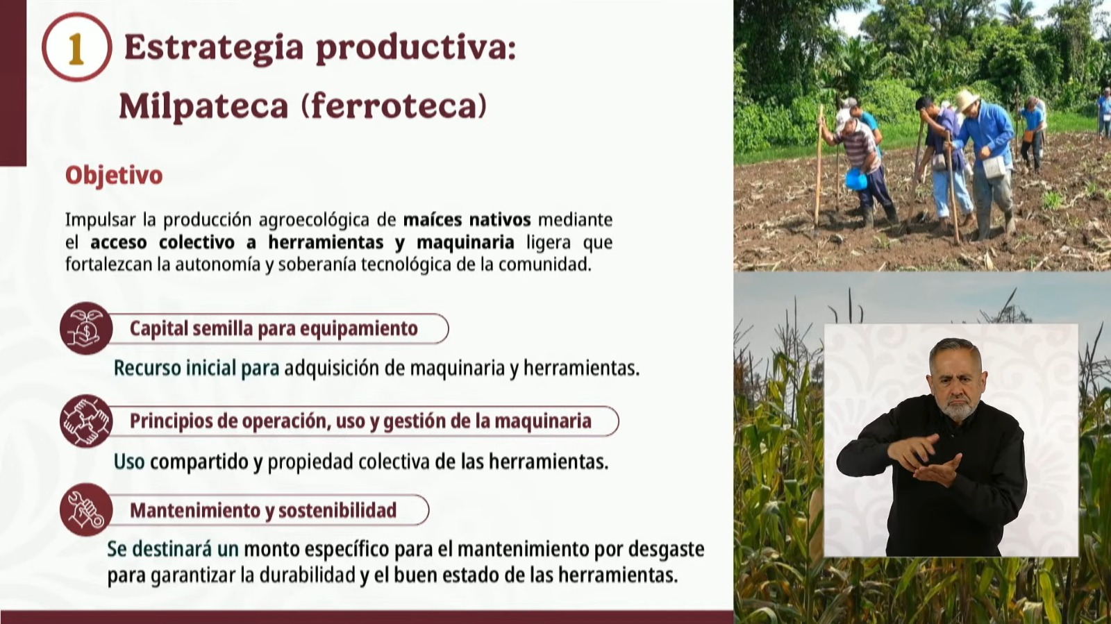 Cada cien productores conformarán una“comunidad milpera”, apoyada por jóvenes de Jóvenes Construyendo el Futuro, quienes ofrecerán asesoría técnica y promoverán el relevo generacional en las zonas rurales. Además, los productores tendrán acceso a equipos agrícolas adaptados a cada región, como sembradoras y desmalezadoras de pequeña escala.