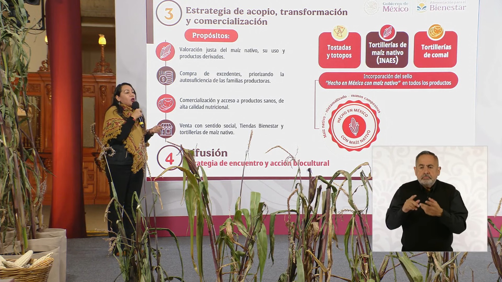 La directora de Alimentación para el Bienestar, María Luisa Albores, destacó que el maíz nativo “no tiene un problema genético, sino agronómico”, por lo que con el acompañamiento adecuado puede triplicarse la producción.