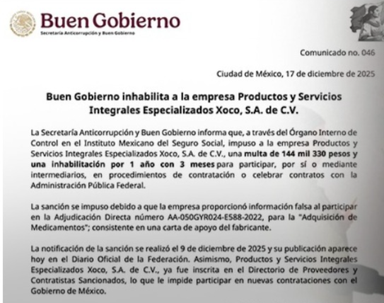 La empresa Productos y Servicios Integrales Especializados Xoco, S.A. de C.V. fue inhabilitada por un periodo de un año y tres meses y sancionada con una multa económica de 144 mil 330 pesos, luego de que se determinó que falseó información durante una licitación para la adquisición de medicamentos realizada en 2022, de acuerdo con la resolución emitida por la autoridad federal.