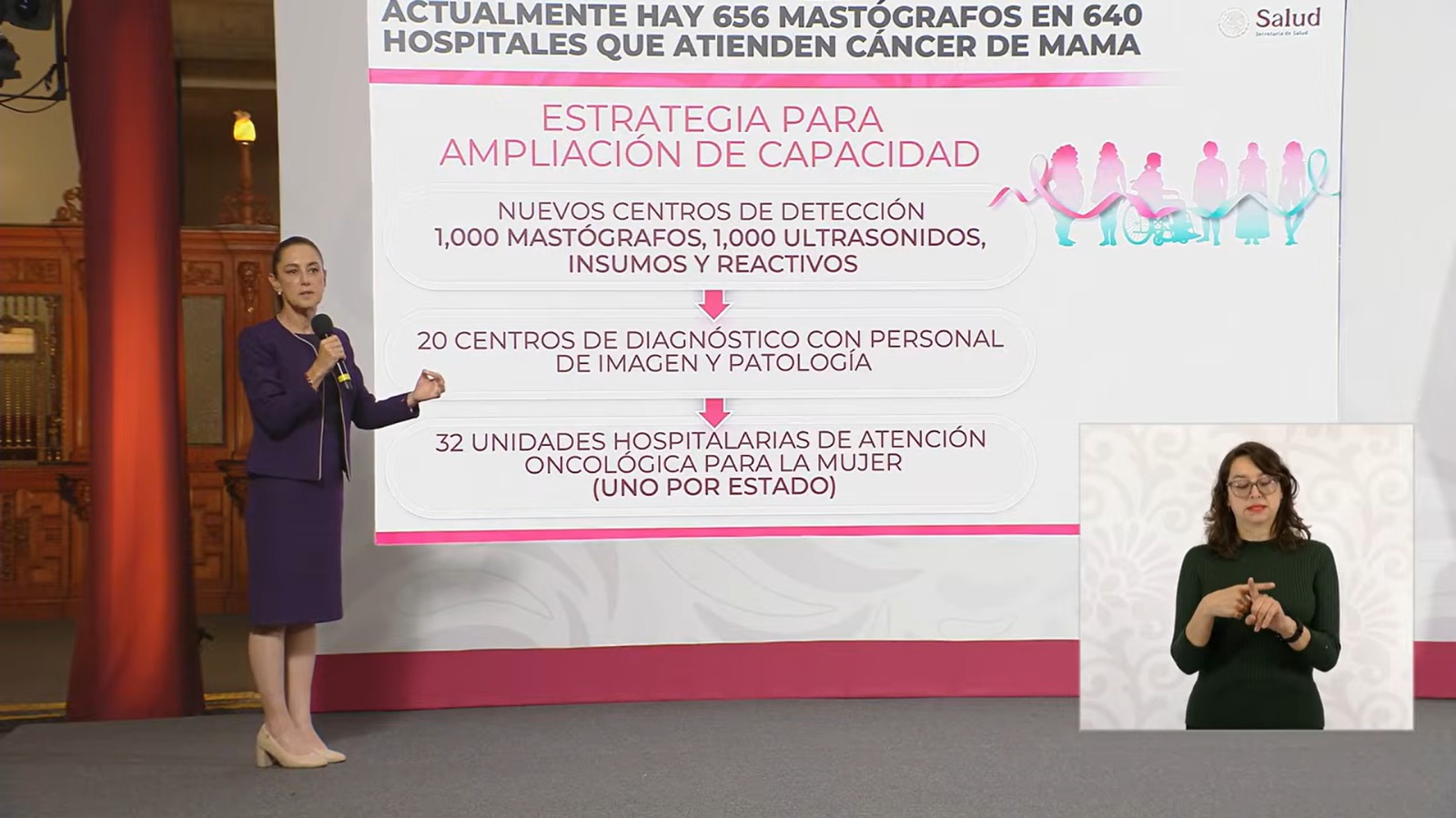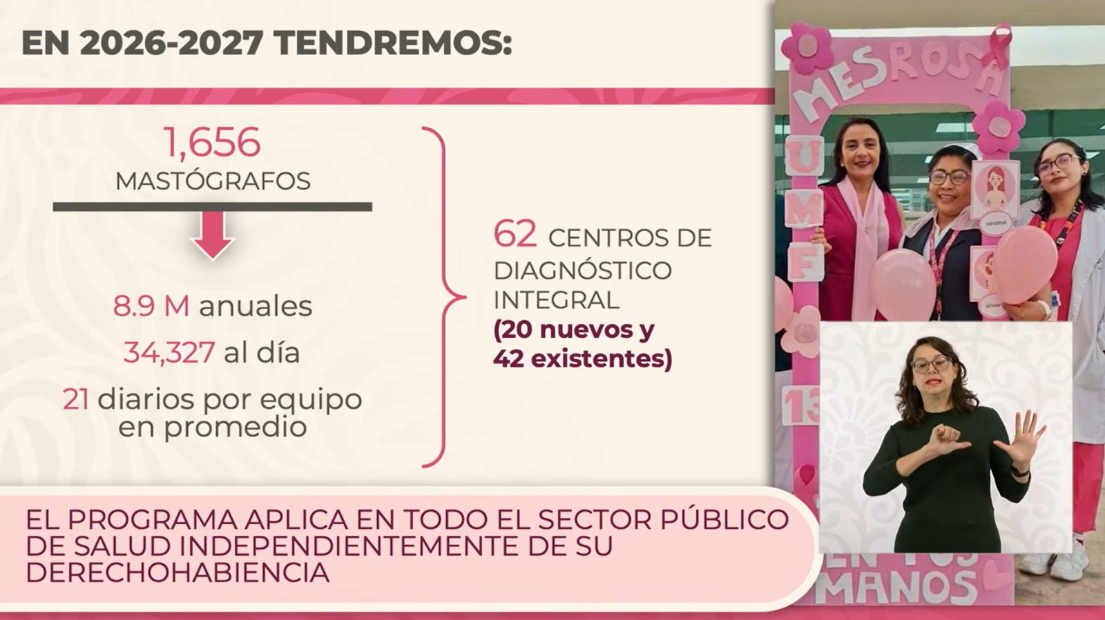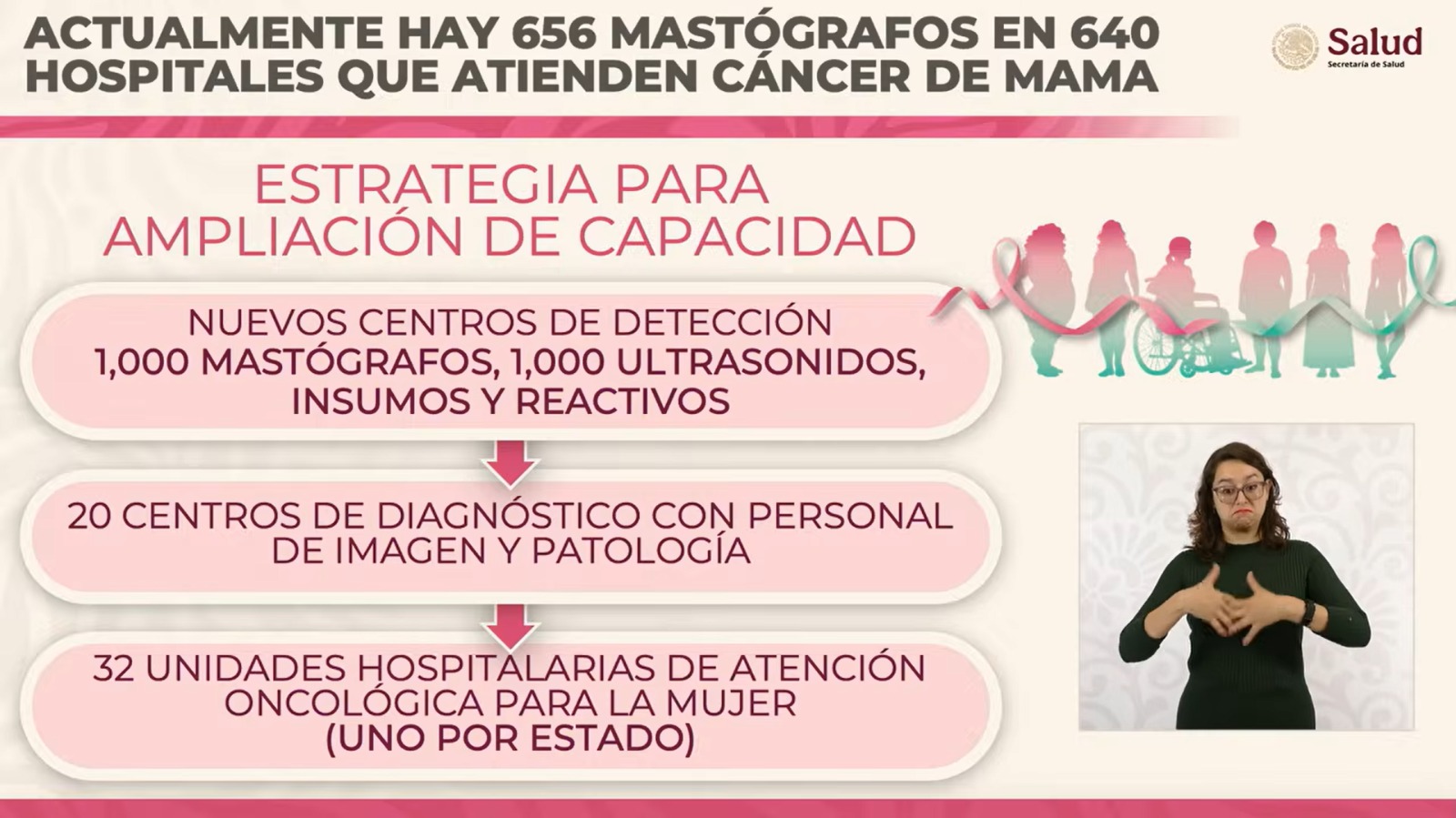Entre las medidas anunciadas destaca la compra de mil mastógrafos y mil ultrasonidos para reforzar la capacidad de diagnóstico en todo el país, con lo que el sistema público contará en total con mil 656 equipos distribuidos en 640 hospitales. Esto permitirá realizar 8.9 millones de mastografías anuales, equivalentes a 34 mil estudios diarios.