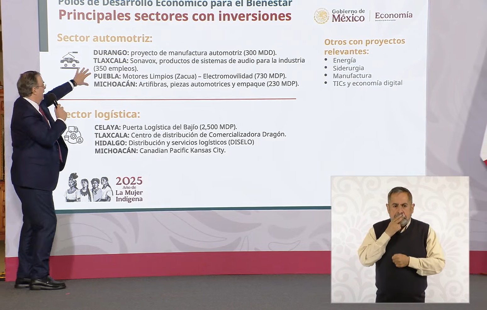 Ebrard detalló que las inversiones confirmadas y ya en curso se concentran en sectores estratégicos. En el ámbito automotriz, los proyectos se desarrollan en entidades como Durango, Tlaxcala, Puebla y Michoacán. En logística, destacó iniciativas clave en Celaya, donde se consolida la puerta logística del Bajío con una inversión de 2 mil 500 millones de pesos, además de centros de distribución en Tlaxcala, proyectos logísticos en Hidalgo y la integración ferroviaria en Michoacán con Canadian Pacific Kansas City.