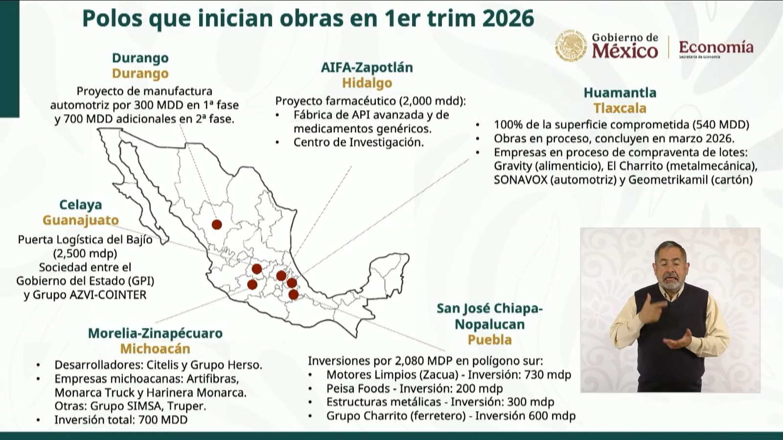 Respecto al calendario, el titular de Economía precisó que entre enero, febrero y marzo de 2026 se concluirán o iniciarán obras en seis polos, ubicados en Durango, Celaya, Morelia, Zinapécuaro, San José Chiapas, Nopalucan en Puebla y Huamantla, Tlaxcala, este último con el 100 por ciento de su superficie ya comprometida. En el segundo trimestre se incorporarán nueve polos adicionales, con lo que se completarán los 15 proyectos establecidos en el plan presidencial.