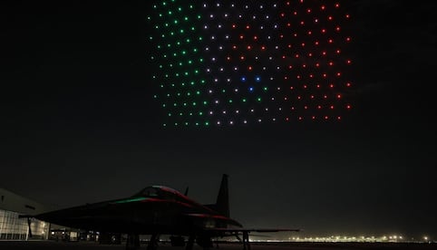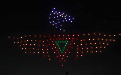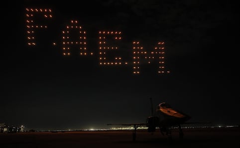 Espectáculo de Drones: El punto culminante de la noche fue un espectáculo de drones luminosos que se elevó sobre el cielo de Santa Lucía. Los vehículos no tripulados dibujaron en el aire figuras históricas como el águila militar, aviones de combate y la leyenda “Escuadrón 201”. Este despliegue simbolizó la evolución de la fuerza aérea y sirvió como un tributo visual a los héroes.
