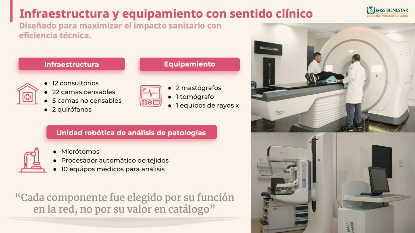 El proyecto aplica los recursos con criterios clínicos y de red, de modo que cada componente cumple una función específica en la cadena de atención. El hospital contará con dos mastógrafos digitales, capaces de realizar más de seis mil estudios anuales por equipo con diagnóstico inmediato, y una unidad robótica de patología que reducirá los tiempos de confirmación diagnóstica a menos de la mitad, con capacidad para efectuar mil 200 pruebas por turno.
