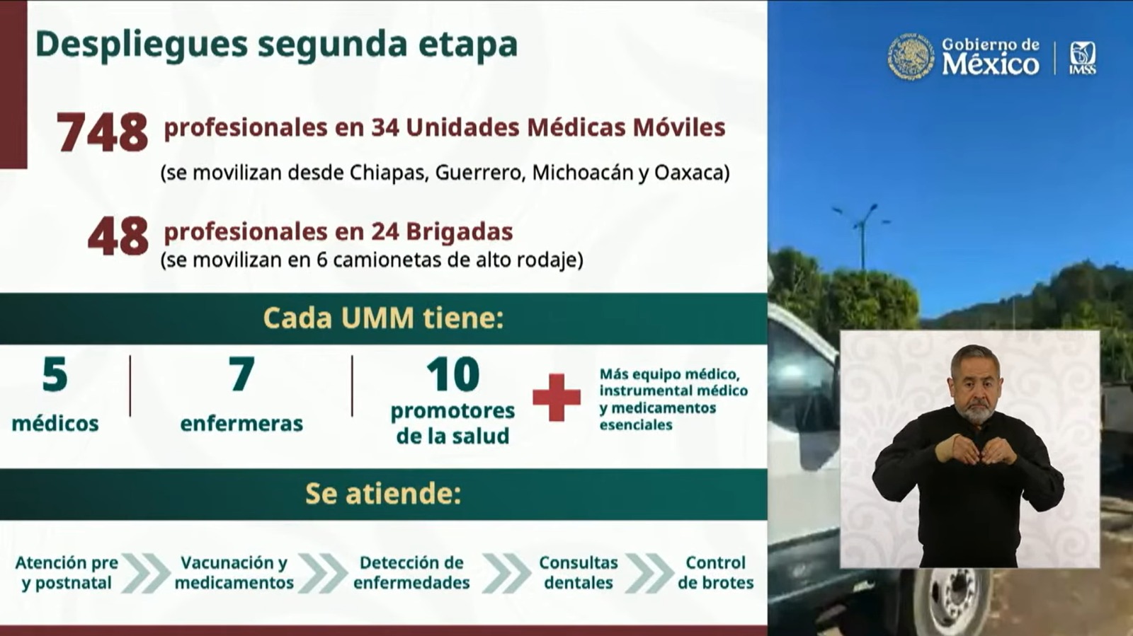 El Instituto Mexicano del Seguro Social (IMSS) y el Instituto de Seguridad y Servicios Sociales de los Trabajadores del Estado (ISSSTE) desplegaron brigadas médicas, personal de emergencia y unidades móviles para mantener la atención a la población tras las afectaciones a clínicas de salud ocasionadas por las lluvias e inundaciones en Veracruz, Puebla, Hidalgo, San Luis Potosí y Querétaro.