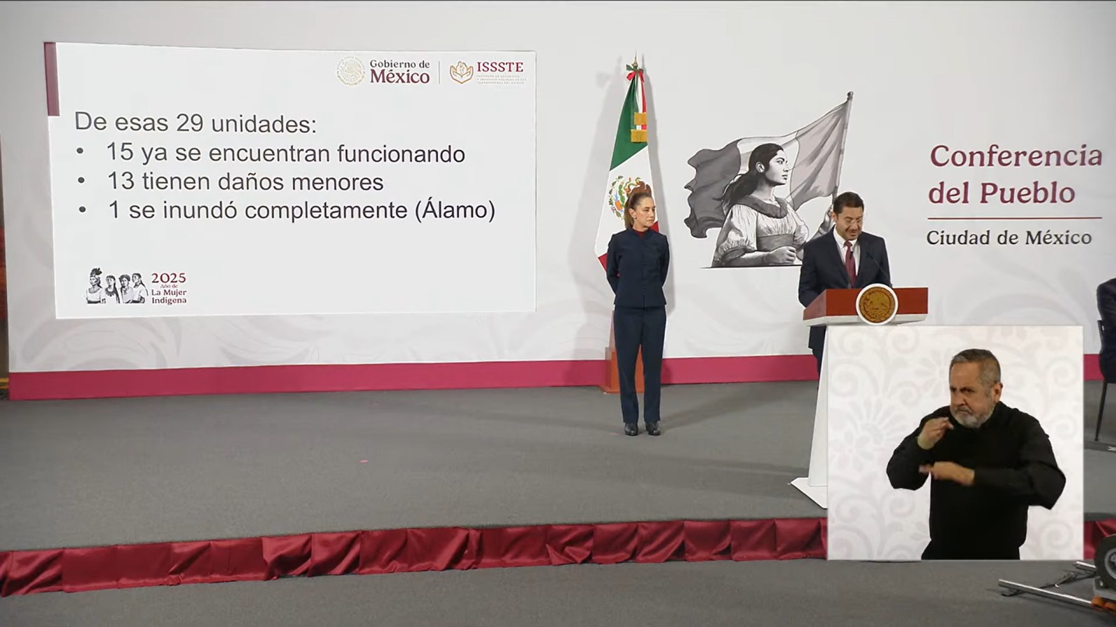 Por su parte, el director del ISSSTE, Martí Batres Guadarrama, reportó 29 unidades médicas con daños en los cinco estados mencionados. De estas, 15 ya reanudaron operaciones, 13 presentan daños menores y una —ubicada en El Álamo, Veracruz— resultó inundada por completo, con pérdida total del equipo tras alcanzar dos metros de agua. Sin embargo, el personal continúa brindando atención fuera del inmueble.