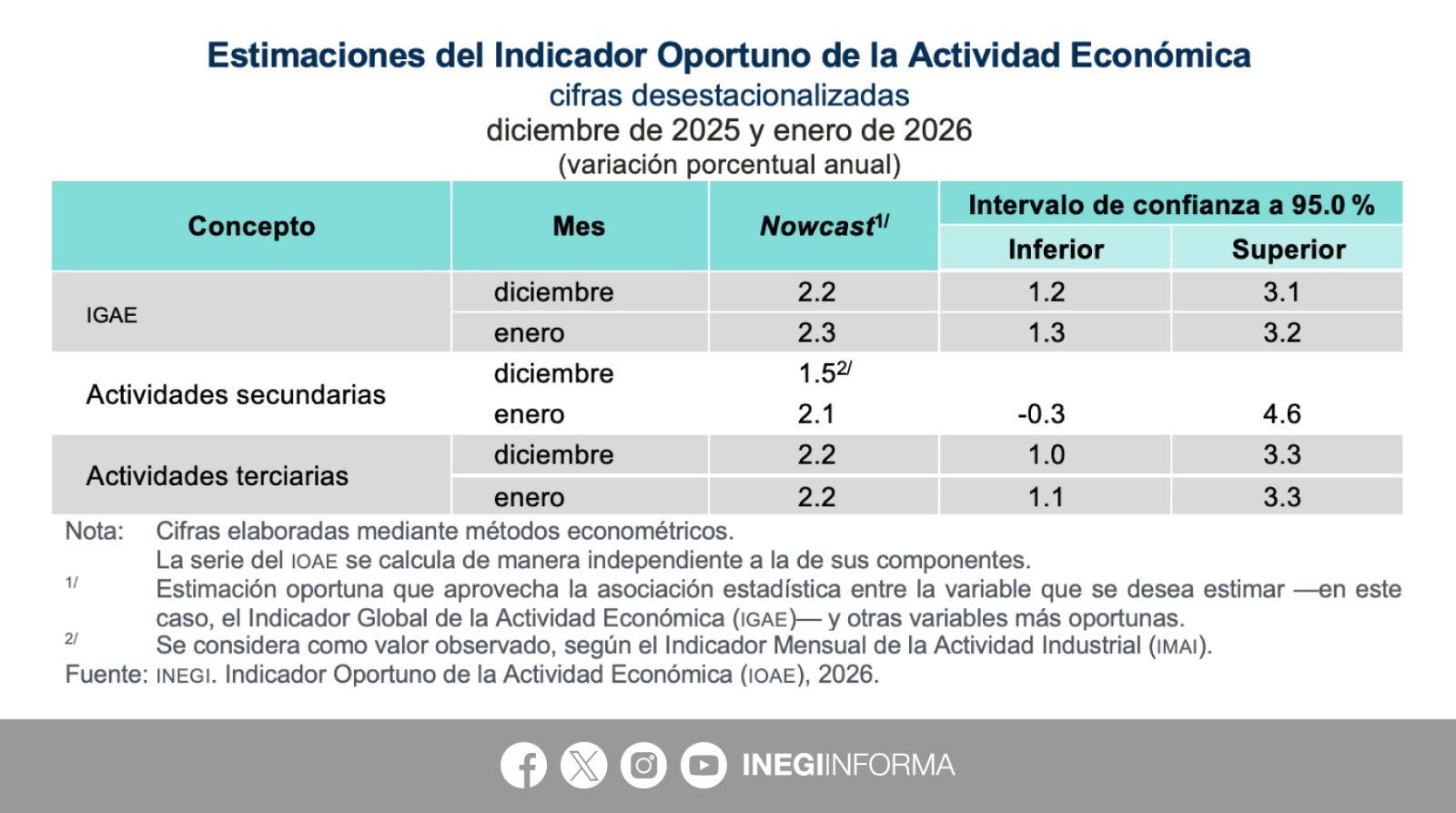 Con estos resultados, México inicia 2026 con crecimiento anual y avance mensual positivo, en un escenario de expansión moderada y continuidad en los principales sectores productivos.