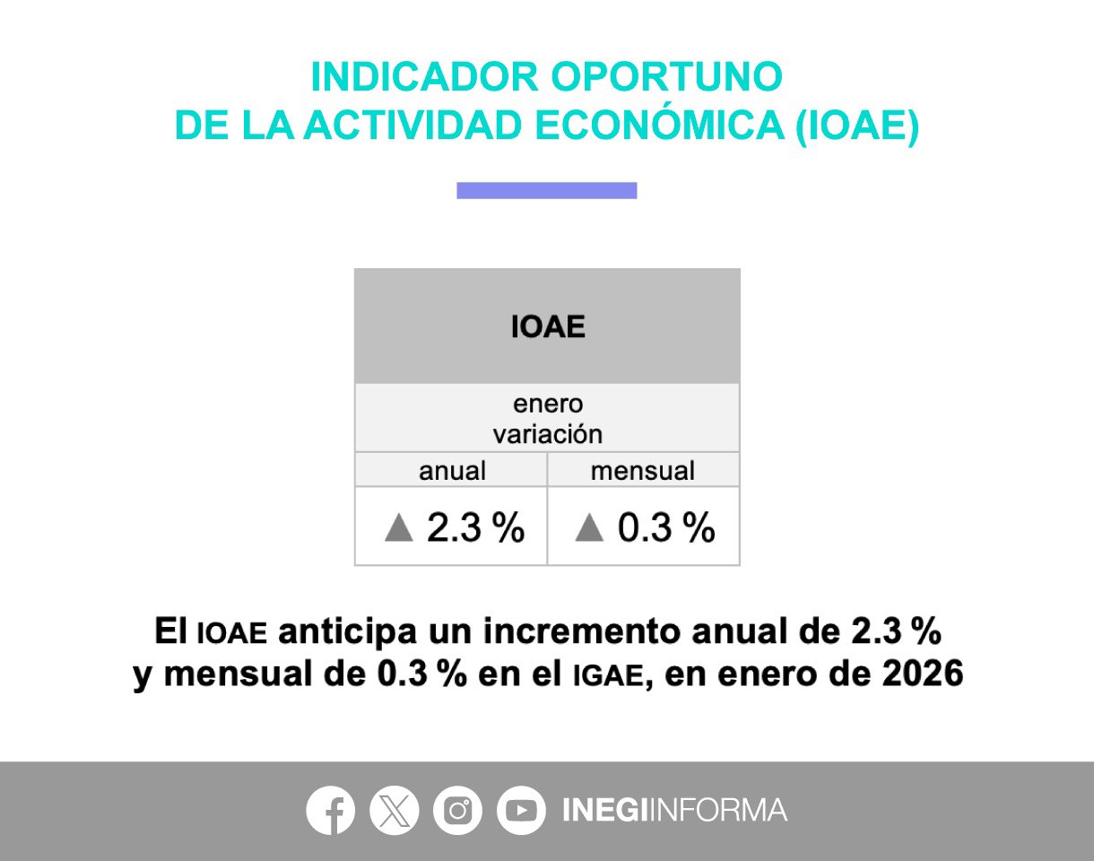 La economía mexicana comenzó 2026 con señales claras de crecimiento. De acuerdo con el Indicador Oportuno de la Actividad Económica (IOAE) publicado por el INEGI, en enero se estima un incremento anual de 2.3 % en el Indicador Global de la Actividad Económica (IGAE), además de un avance mensual de 0.3 % respecto a diciembre de 2025.