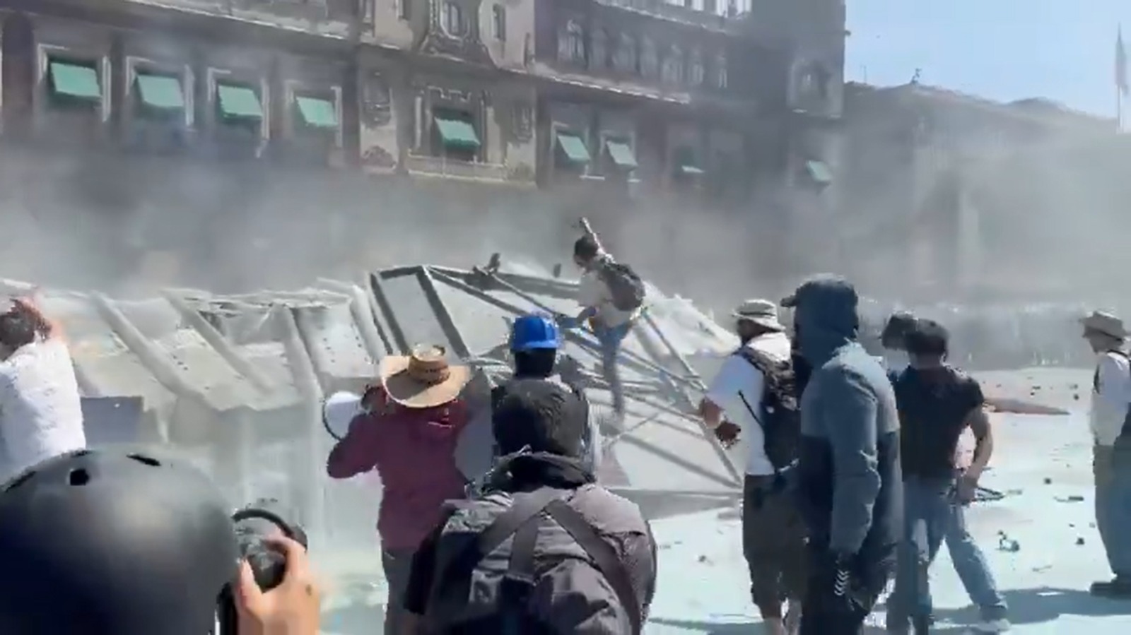 Un grupo de participantes de la movilización avanzó hasta el Zócalo capitalino, donde comenzaron a golpear y derribar parte del cerco instalado frente a Palacio Nacional, pese al despliegue de seguridad previamente anunciado.