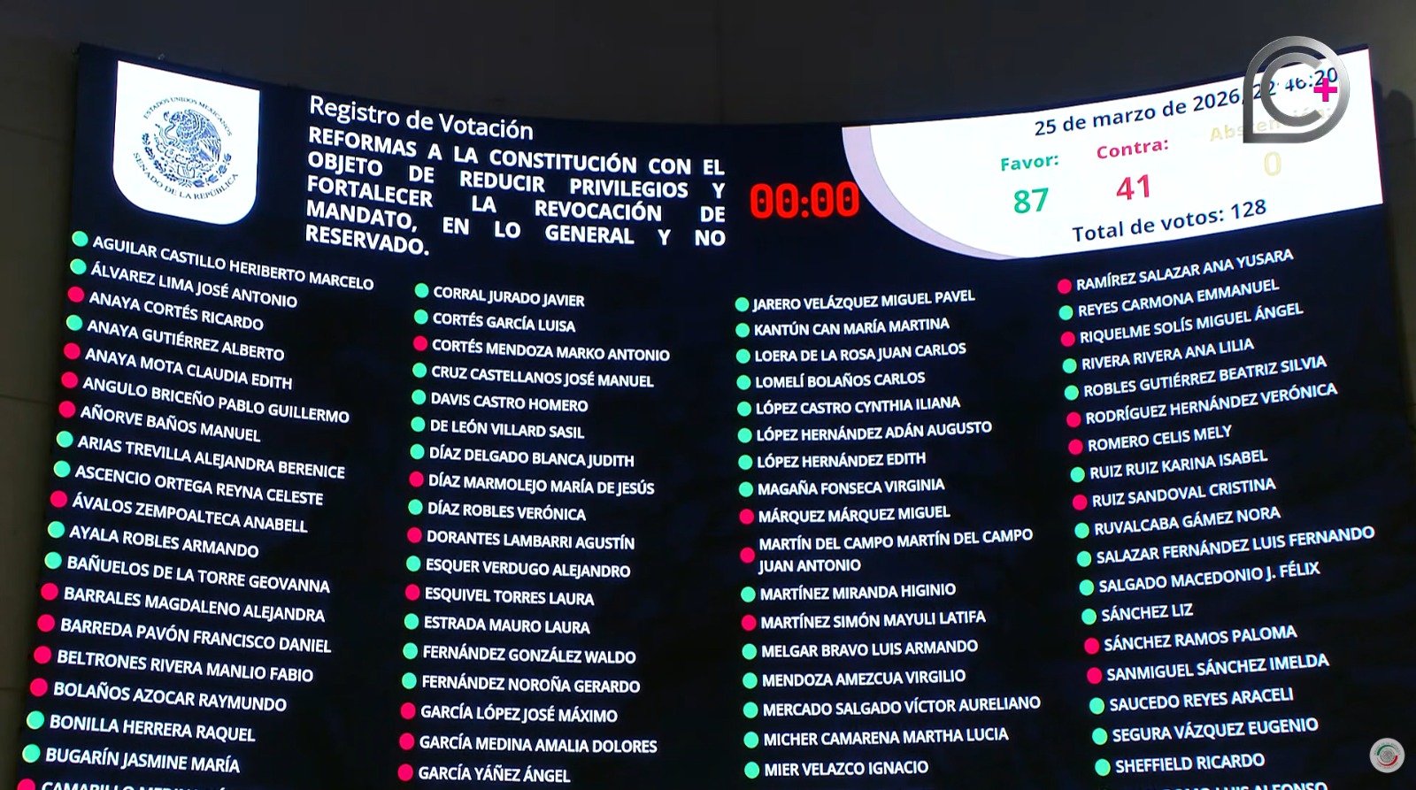 Tras más de cuatro horas de debate, el Senado de la República aprobó en lo general el denominado Plan B en materia electoral con 87 votos a favor, 41 en contra y 0 abstenciones, logrando la mayoría requerida de un total de 128 legisladores.