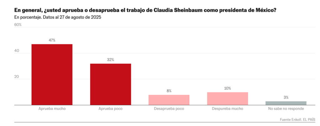 Claudia Sheinbaum llega a su primer informe de Gobierno invicta en las encuestas. A un año de haber asumido la Presidencia, 79% de los mexicanos respaldan su gestión, de acuerdo con un estudio de Enkoll para EL PAÍS y W Radio.