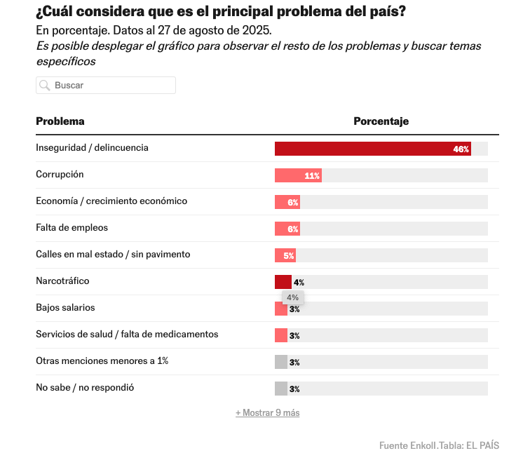La seguridad es el tema más sensible en la percepción ciudadana. Aun así, medidas como la entrega de 55 narcotraficantes a Estados Unidos cuentan con un respaldo del 68%.