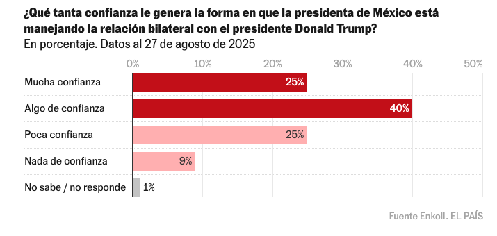 En su relación con Donald Trump —el factor internacional que genera más interés de mexicanas y mexicanos—, la presidenta mantiene la confianza de 65% de los encuestados. Aunque esa cifra ha bajado desde diciembre de 2024 (cuando alcanzó el 75%), la popularidad de Sheinbaum no se ha visto afectada: la mayoría reconoce sus esfuerzos para blindar la frontera y enfrentar el tráfico de fentanilo.
