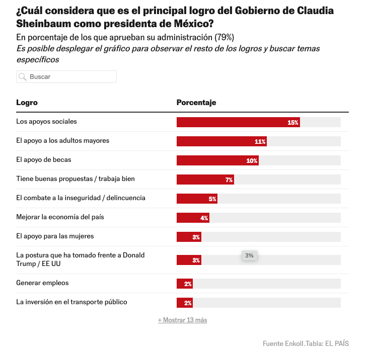 La encuesta revela un contraste que marca la diferencia: Sheinbaum llega a este primer balance seis puntos por encima del nivel de aprobación con el que lo hizo Andrés Manuel López Obrador. Además, un 49% de los encuestados considera que su arranque de Gobierno “ha sido mejor” que el del expresidente, y un 14% asegura que igual de bueno.