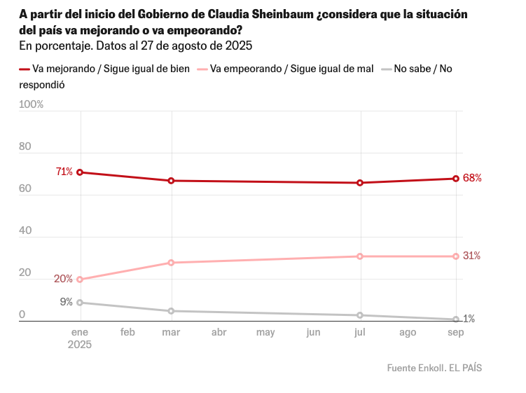 Claudia Sheinbaum inicia su segundo año de Gobierno con una aprobación que roza el 80% y con la confianza de la mayoría de los ciudadanos en que el rumbo del país va hacia adelante. Un dato contundente: siete de cada diez mexicanos creen que las cosas mejorarán en este sexenio.