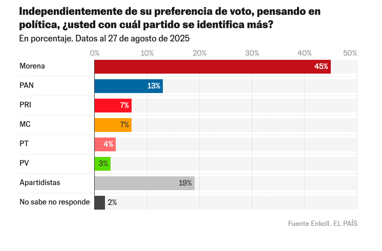 La fotografía política también refleja la fortaleza del movimiento guinda: 45% de la población se identifica con Morena, mientras que el PAN se queda en un lejano 13% y el PRI y MC apenas alcanzan 7%.