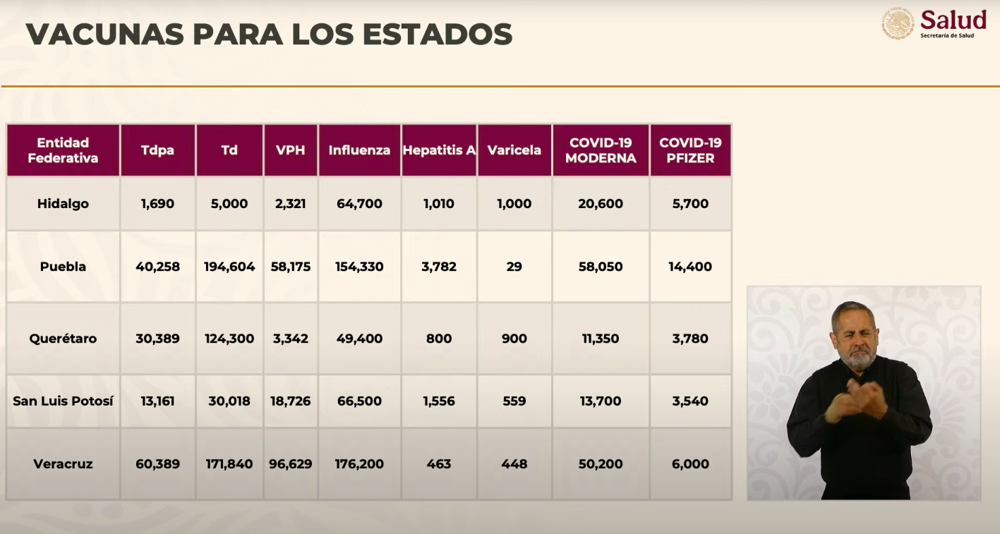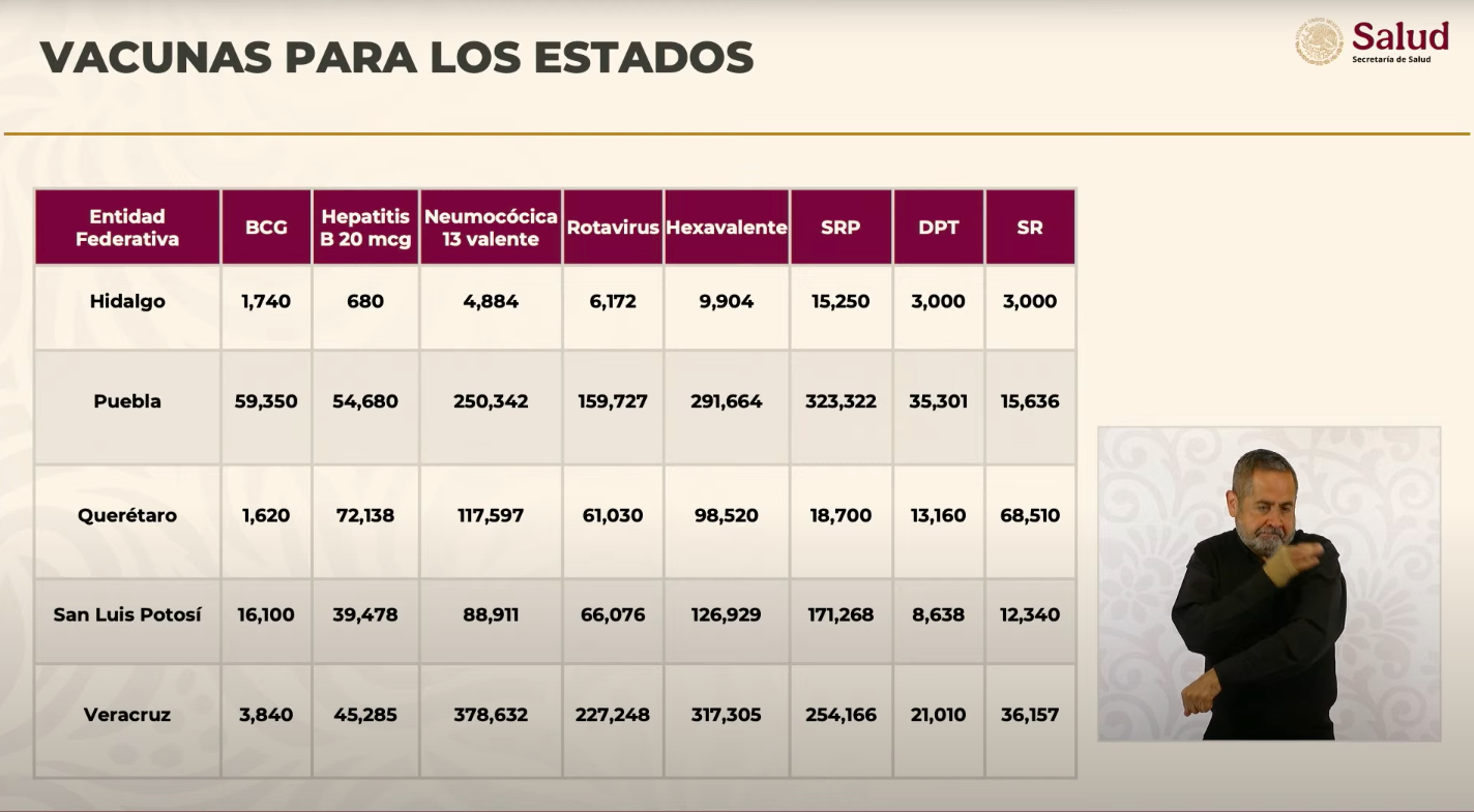Puebla y San Luis Potosí también recibieron grandes dotaciones, con más de 291 mil y 126 mil dosis hexavalentes, respectivamente.