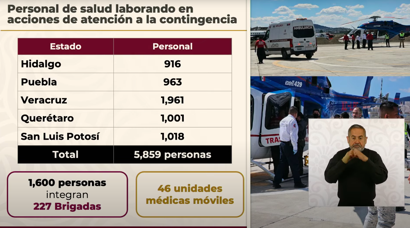 El operativo federal incluye la participación de 5 mil 859 trabajadores, de los cuales mil 961 se encuentran en Veracruz, mil 18 en San Luis Potosí, mil 1 en Querétaro, 963 en Puebla y 916 en Hidalgo. A ellos se suman 46 unidades médicas móviles que brindan atención a comunidades rurales y zonas de difícil acceso, algunas trasladadas por vía aérea.