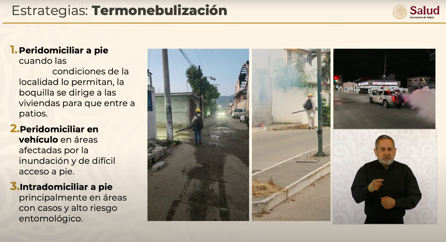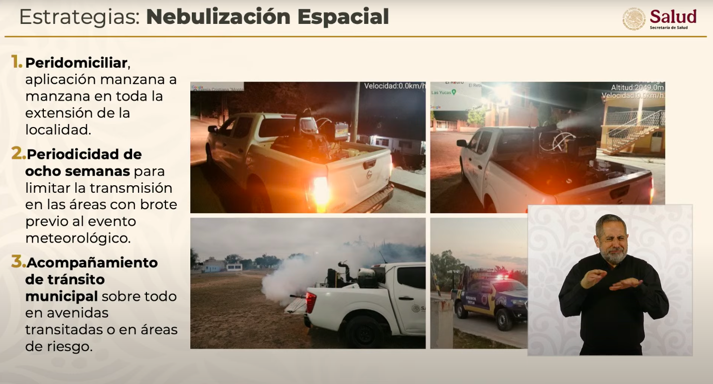 - Nebulización espacial: aplicación manzana por manzana con periodicidad de ocho semanas para evitar brotes, acompañada por personal de tránsito y protección civil.