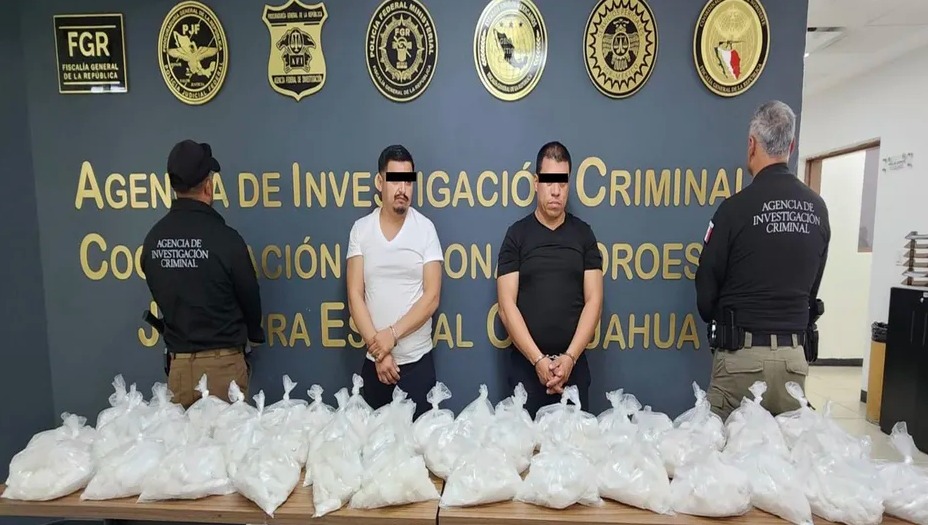 En Chihuahua, durante una inspección realizada por la FGR a un autobús en un filtro de seguridad en Ciudad Juárez, fueron detenidos dos hombres y se aseguraron cuarenta y cuatro kilos de metanfetamina.