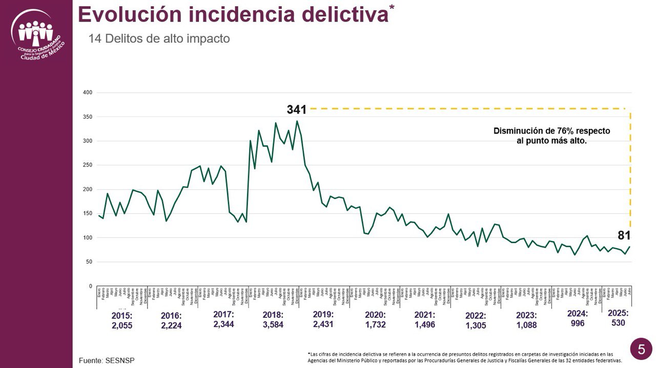 CDMX.- La Alcaldía Azcapotzalco mantiene un a disminución sostenida en 12 de los 14 delitos de alto impacto, en la comparación de los periodos de enero a julio de 2024 y 2025, difundida por el Consejo Ciudadano para la Seguridad y Justicia, con datos del Secretariado Ejecutivo del Sistema Nacional de Seguridad Pública.