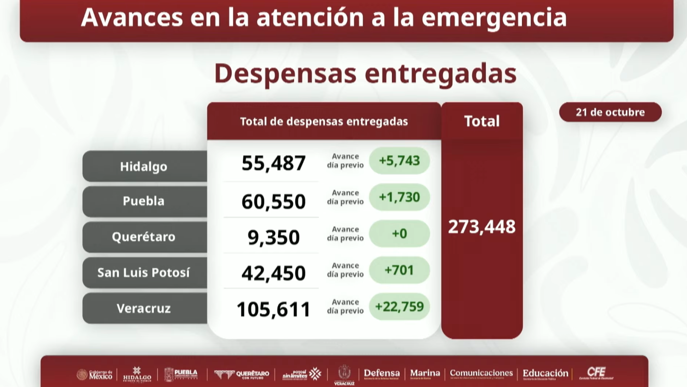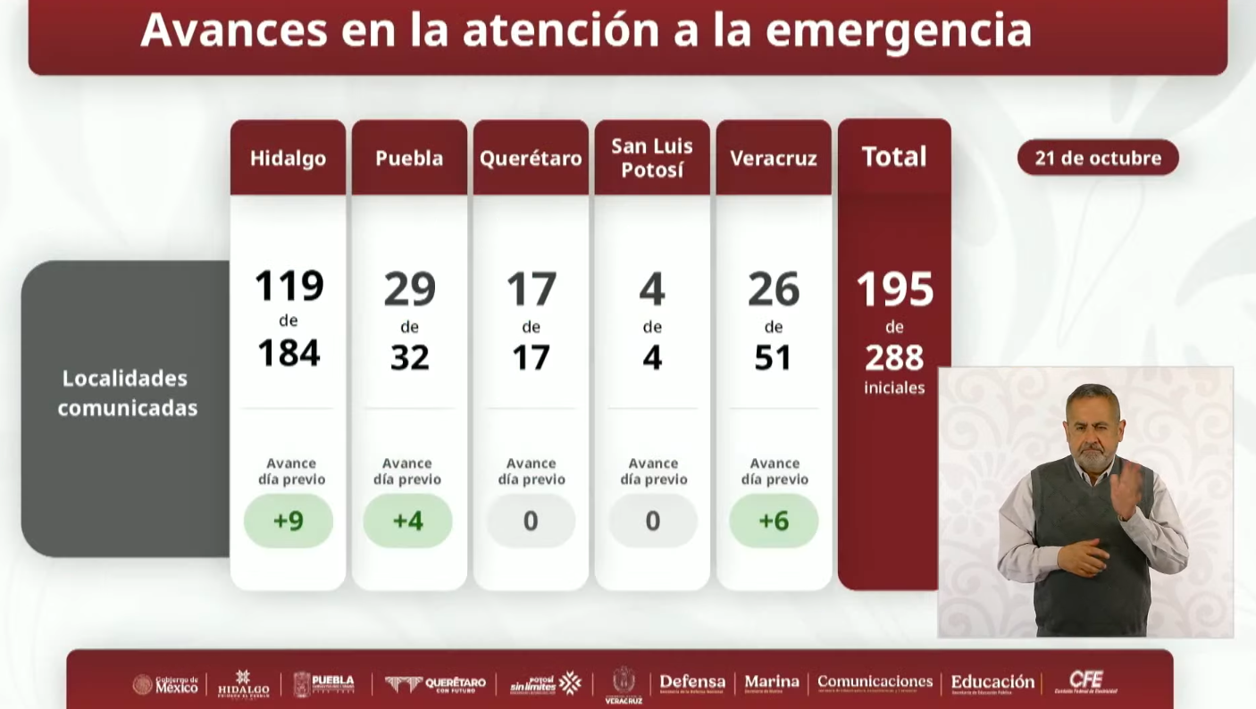 En materia de infraestructura, 195 de 288 localidades quedaron ya comunicadas, tras el despeje de caminos y carreteras, con 19 tramos abiertos tan solo en la jornada previa. Los mayores progresos se registraron en Hidalgo (+9) y Veracruz (+6).