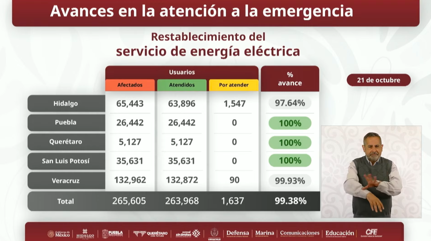 La Comisión Federal de Electricidad (CFE) informó que el restablecimiento del servicio eléctrico alcanza 99.38%, con estados como Puebla, Querétaro y San Luis Potosí operando al 100%. En total, 263 mil 968 de los 265 mil 605 usuarios afectados ya cuentan nuevamente con luz.