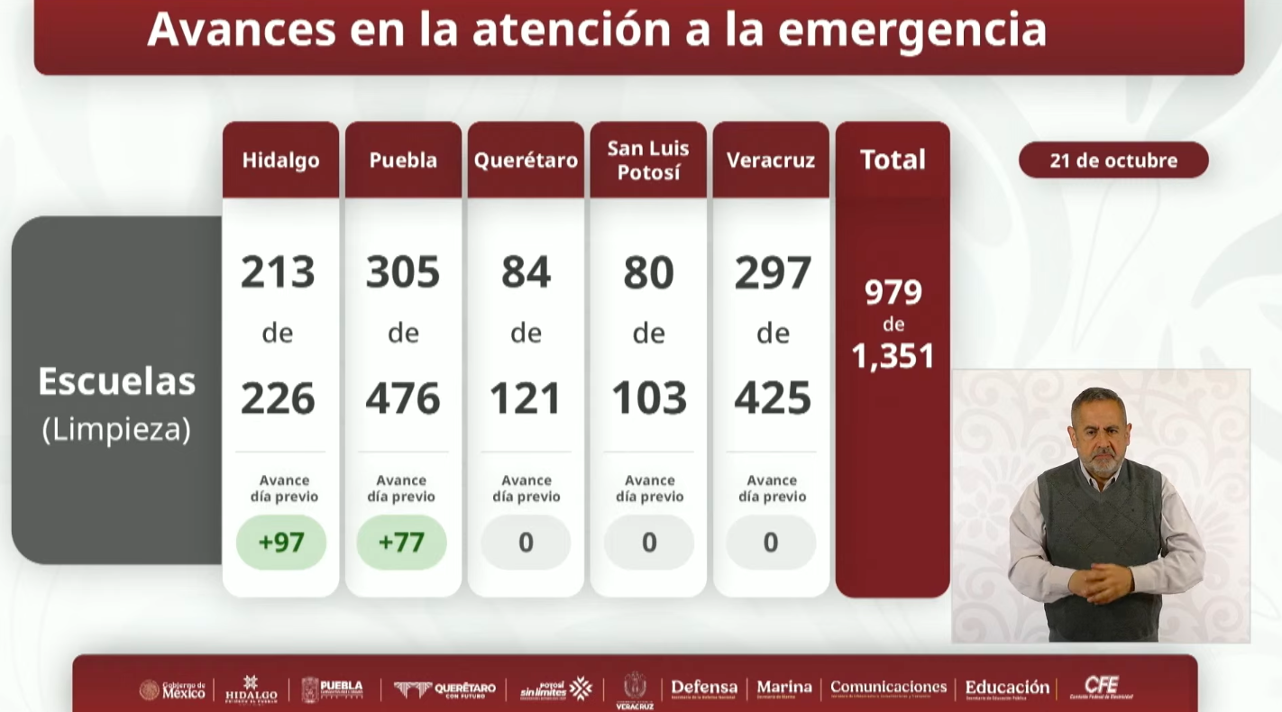 En el sector educativo, 979 de las mil 351 escuelas que sufrieron afectaciones ya fueron limpiadas y reacondicionadas, lo que representa un avance superior al 70%. Solo en el último día se intervinieron 174 planteles más, principalmente en Hidalgo y Puebla.
