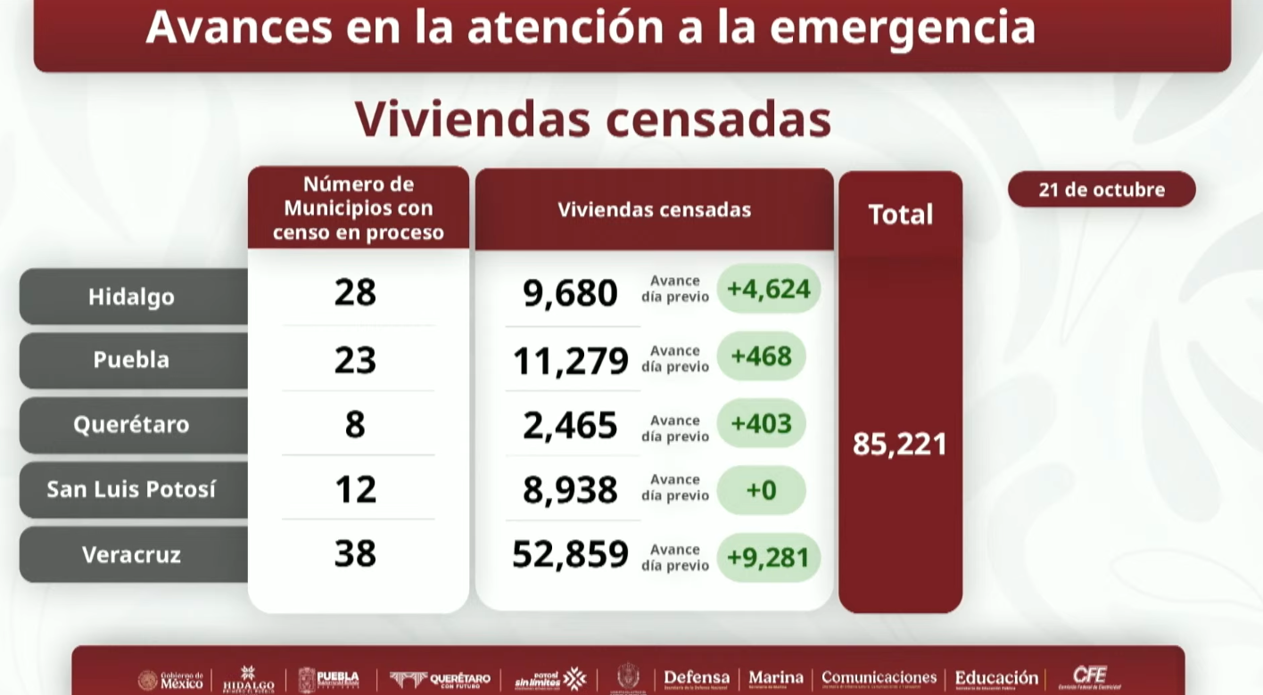 - 85 mil 221 viviendas censadas para identificar daños estructurales y necesidades de reconstrucción, tras un incremento de 14 mil 776 registros en un solo día.