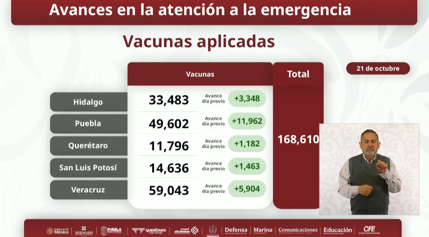 El sector salud reportó 168 mil 610 vacunas aplicadas en las entidades afectadas, lo que representa un incremento de más de 24 mil dosis en comparación con el día anterior. Puebla lideró la jornada con 11 mil 962 vacunas nuevas, seguida de Veracruz con 5 mil 904 y Hidalgo con 3 mil 348.
