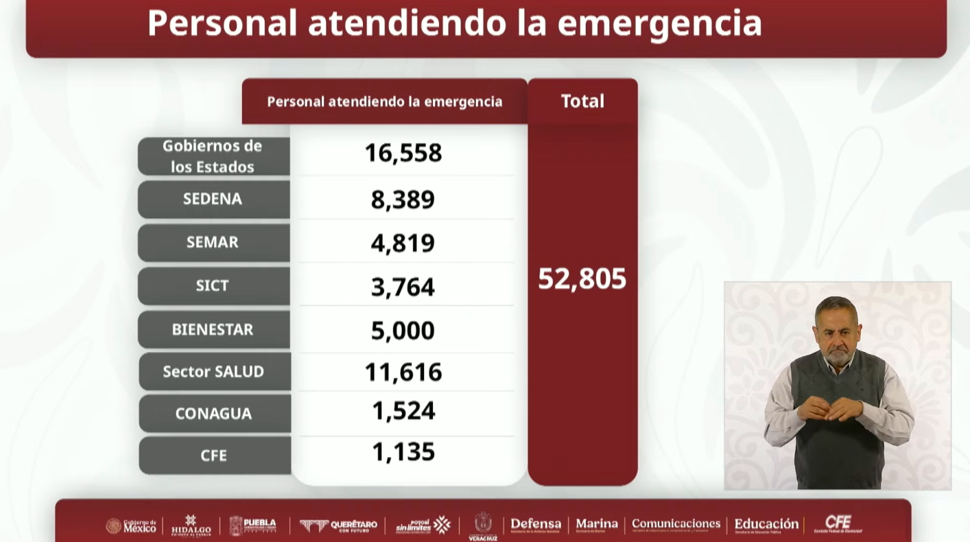 En la respuesta operativa, 52 mil 805 integrantes de distintas dependencias —entre ellos personal de SEDENA, SEMAR, Bienestar, Salud, CONAGUA y gobiernos estatales— continúan en campo atendiendo la emergencia.