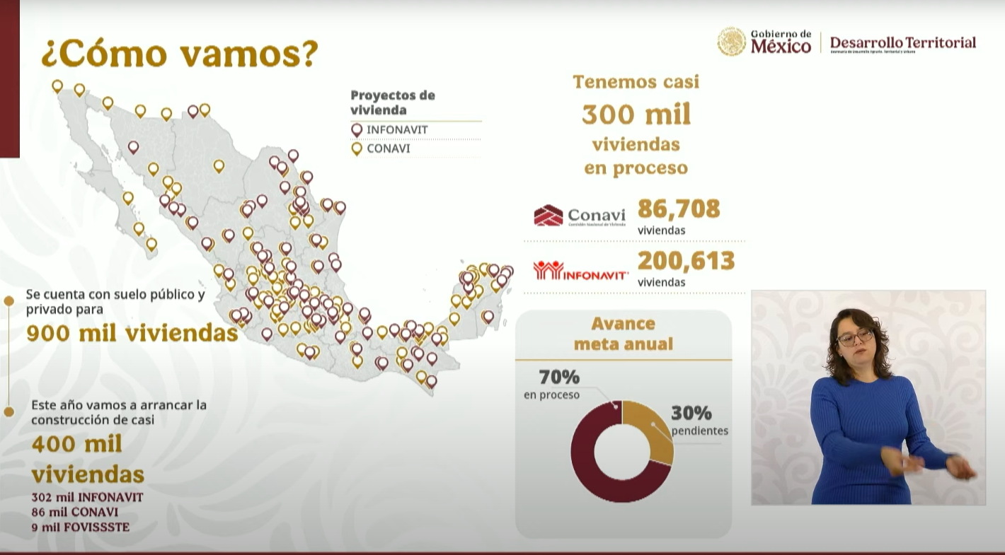 De acuerdo con Vega, 300 mil viviendas están en proceso en todo el país: 200 mil 613 del Infonavit y 86 mil 708 de Conavi, lo que representa un avance del 70% de la meta anual. Pero el plan va más allá: para 2025 se tiene previsto arrancar la construcción de casi 400 mil nuevas casas, respaldadas por suelo público y privado suficiente para levantar 900 mil viviendas en total.