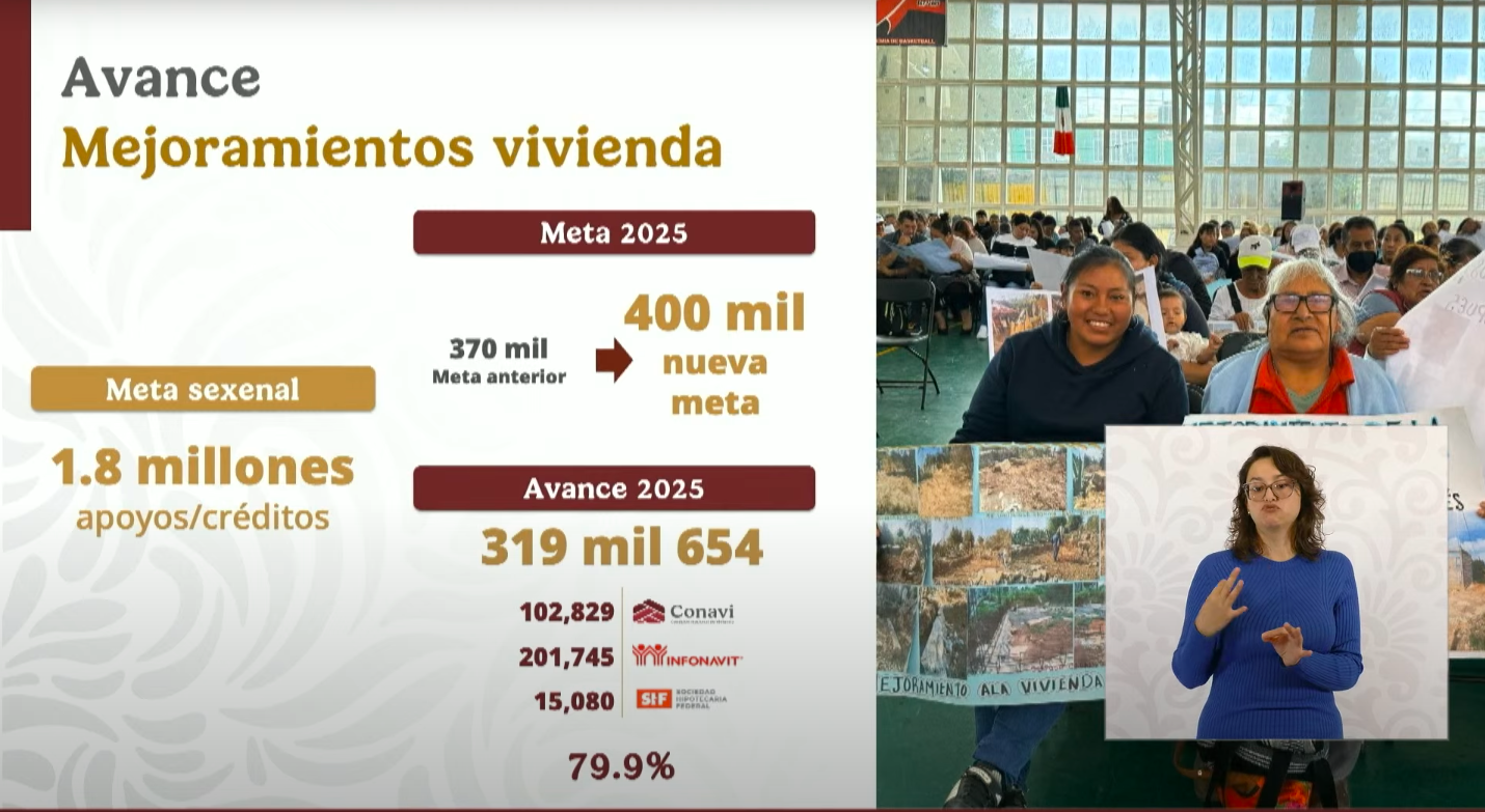 El programa de mejoramientos a vivienda también muestra cifras notables: 319 mil 654 acciones realizadas, lo que equivale al 79.9% de la meta para 2025, con una nueva proyección de 400 mil hogares beneficiados.