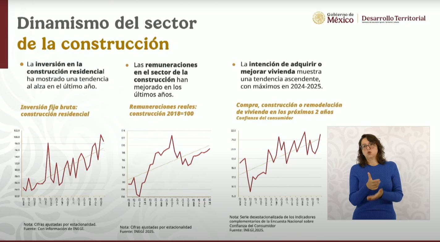 Según los datos de INEGI citados por la Sedatu, la inversión fija bruta en construcción residencial muestra una tendencia al alza, acompañada de mejoras en las remuneraciones reales y un crecimiento sostenido en la intención de compra, remodelación o ampliación de vivienda entre 2024 y 2025.