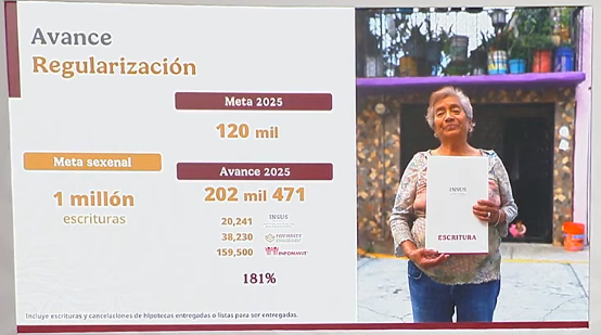 En materia de regularización de la propiedad, el avance es incluso mayor: 202 mil 471 escrituras entregadas, superando ampliamente la meta anual de 120 mil, lo que equivale a un 181% de cumplimiento.